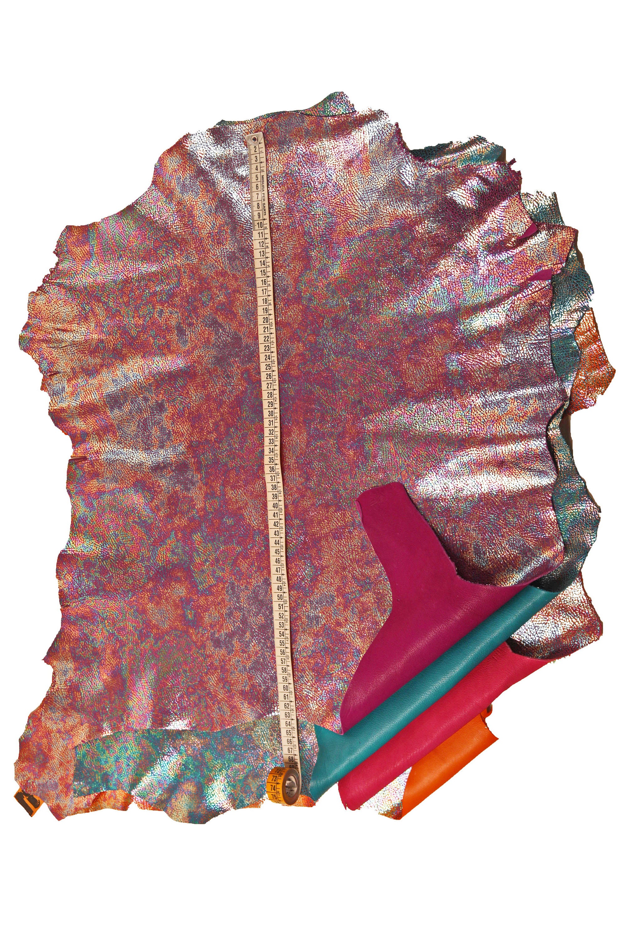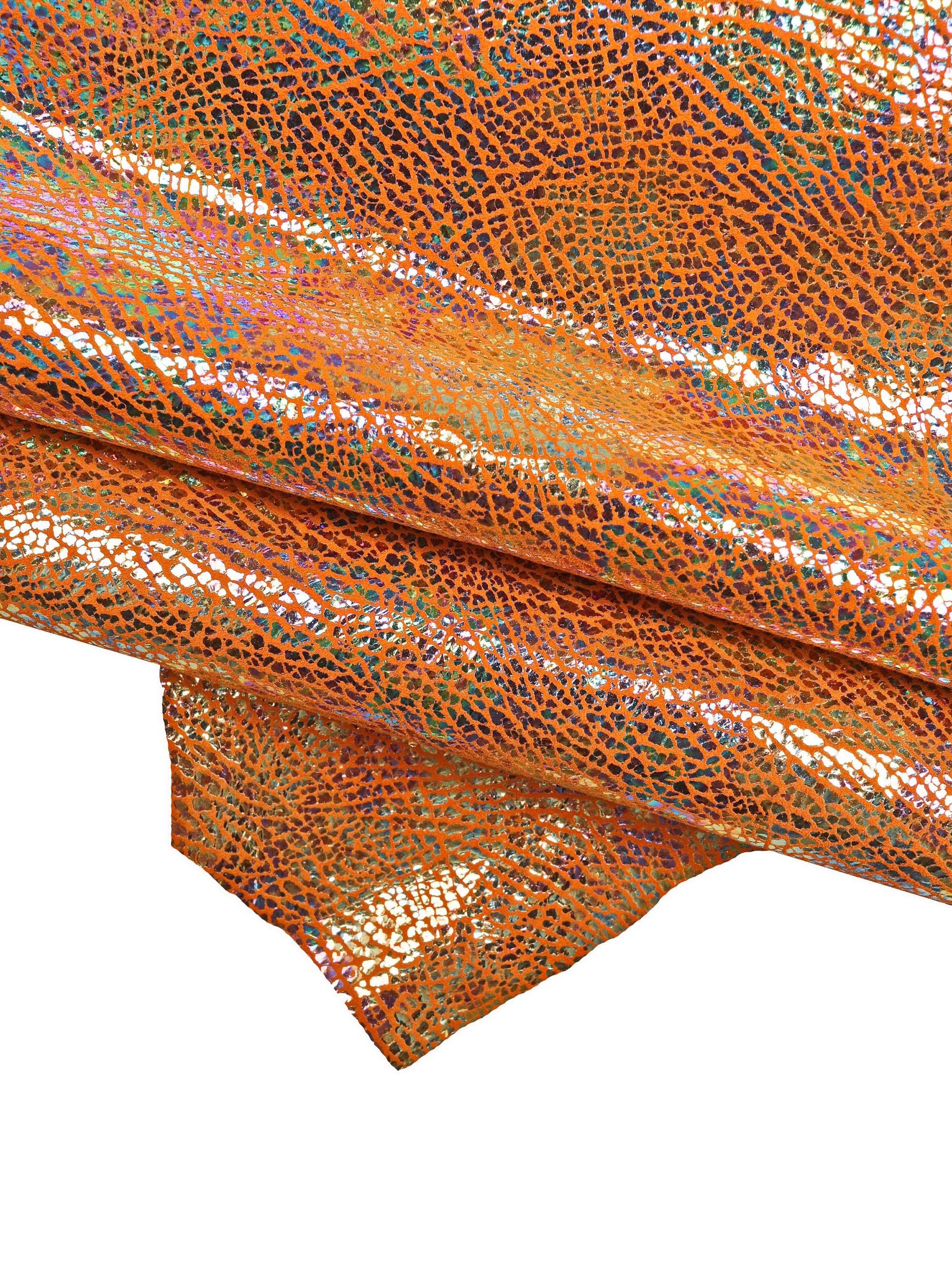 Fabulous holographic crakle printed leather skins, orange metallic suede basis, bright and soft leather skins.