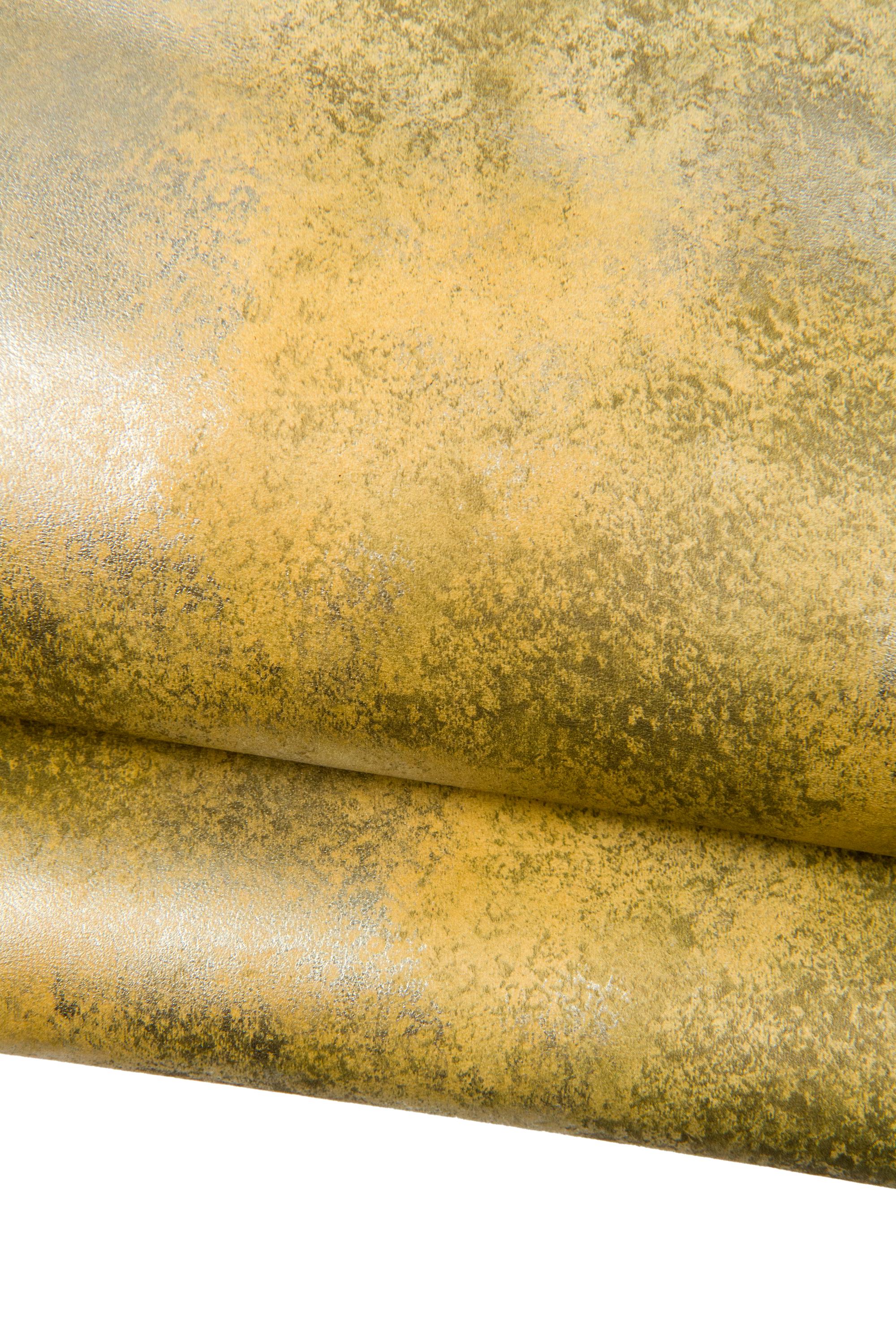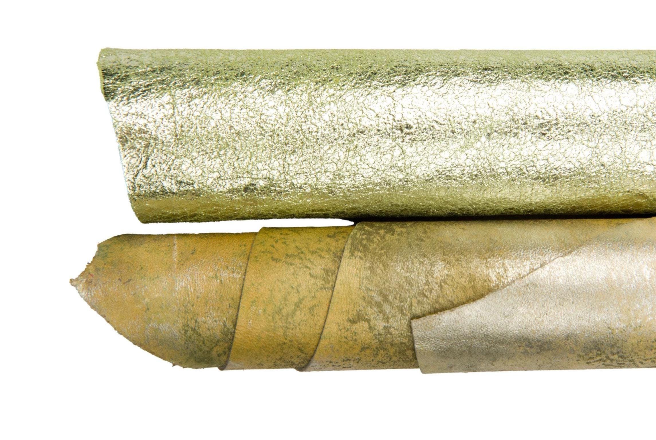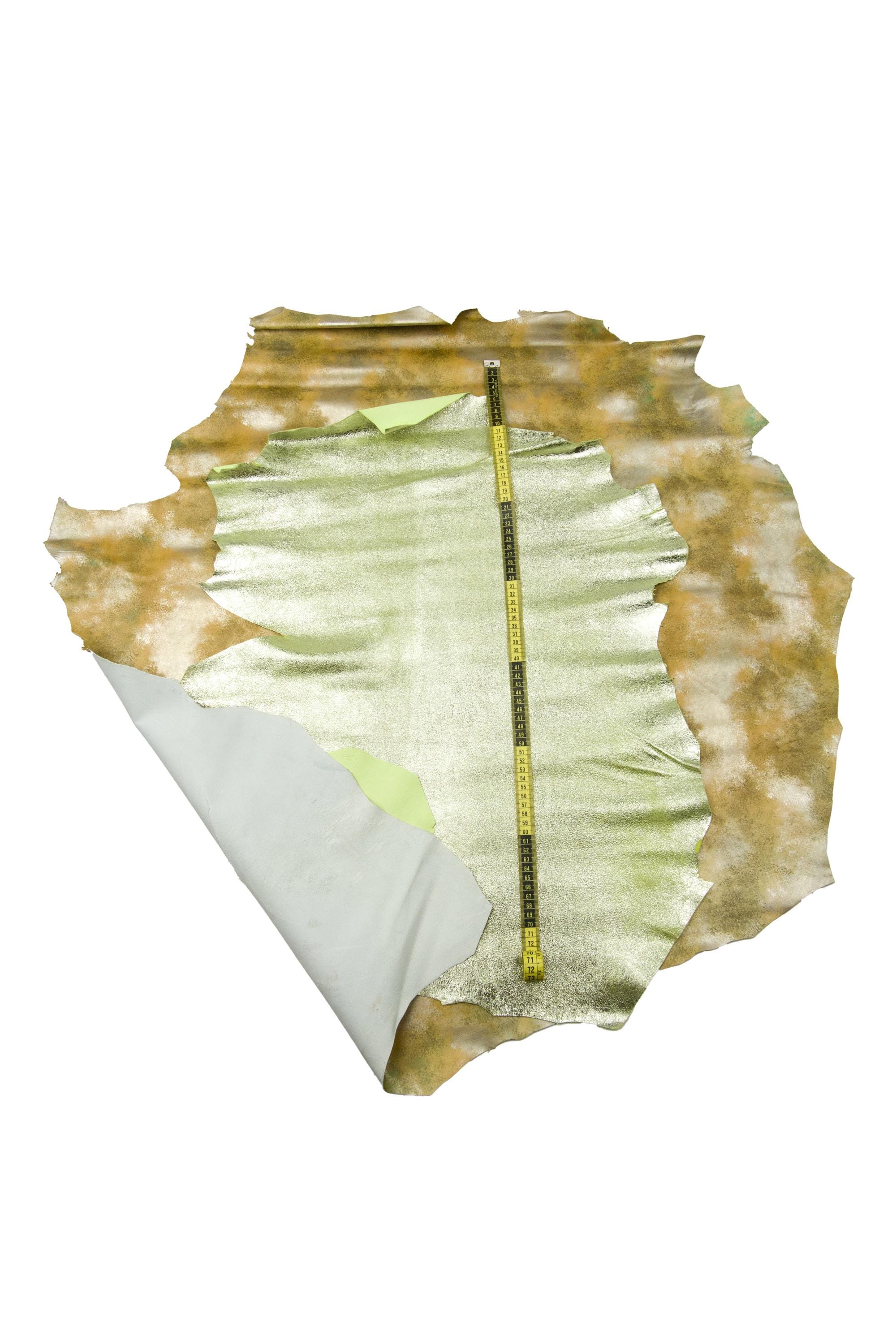 Beautiful lot of 2 top quality matching green yellow leathers, metallic soft goatskin. for DIY.