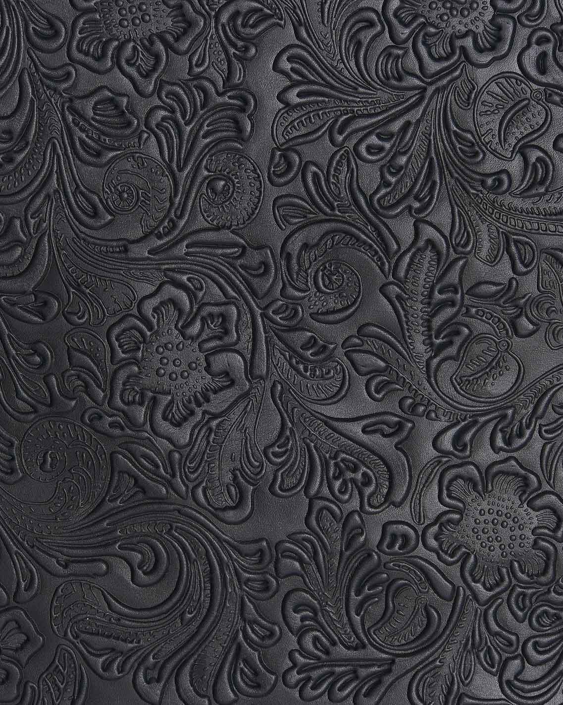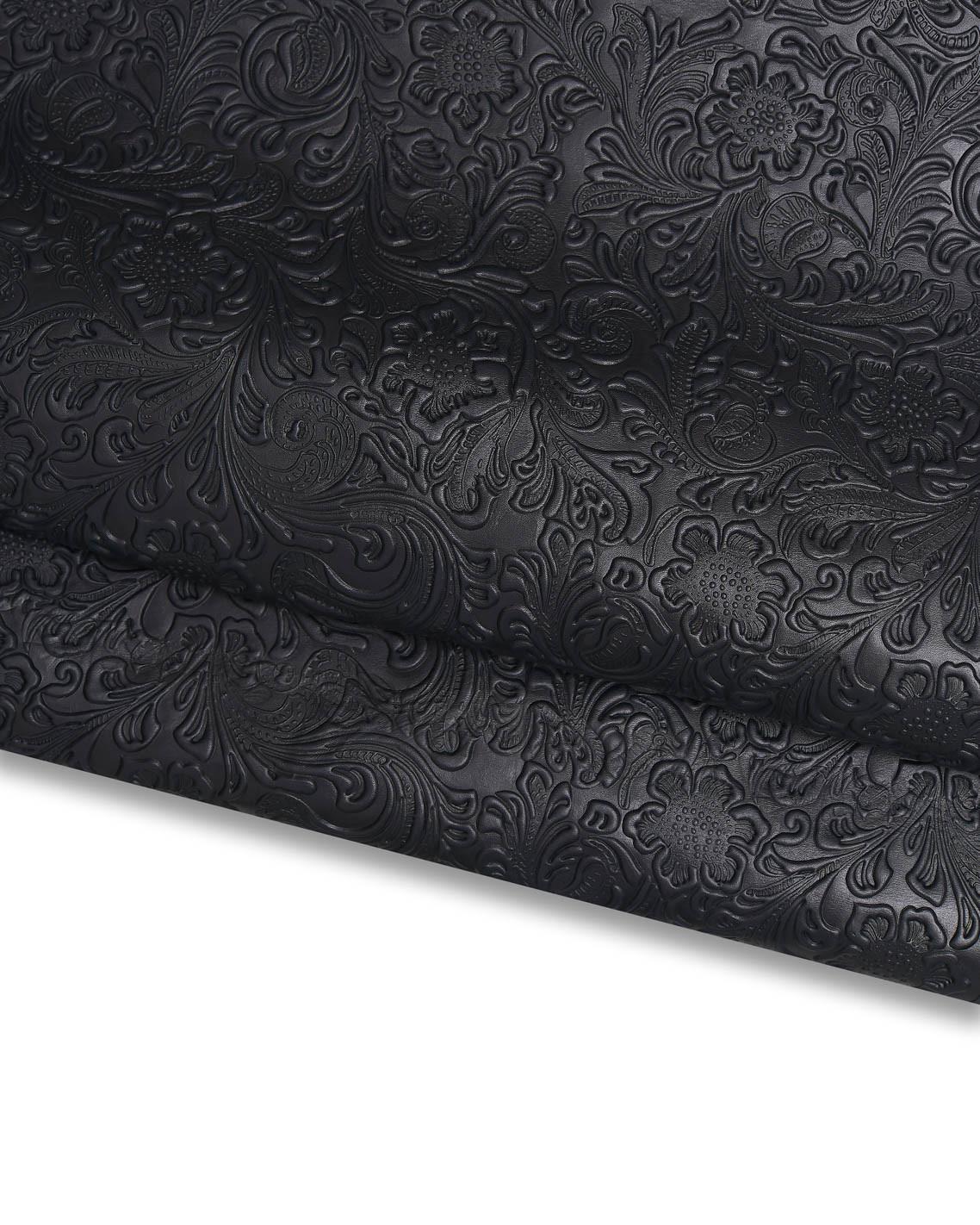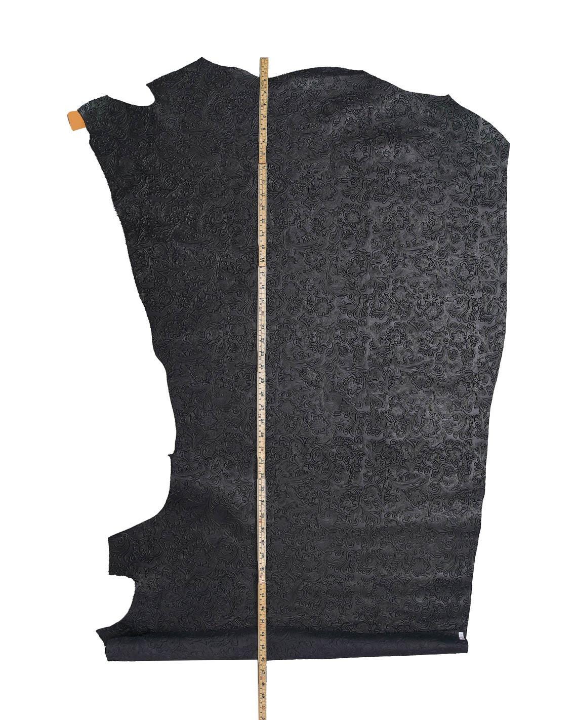 Incredible dark brown/black calfskin with embossed floral charro print, soft and semi-gloss for DIY projects.