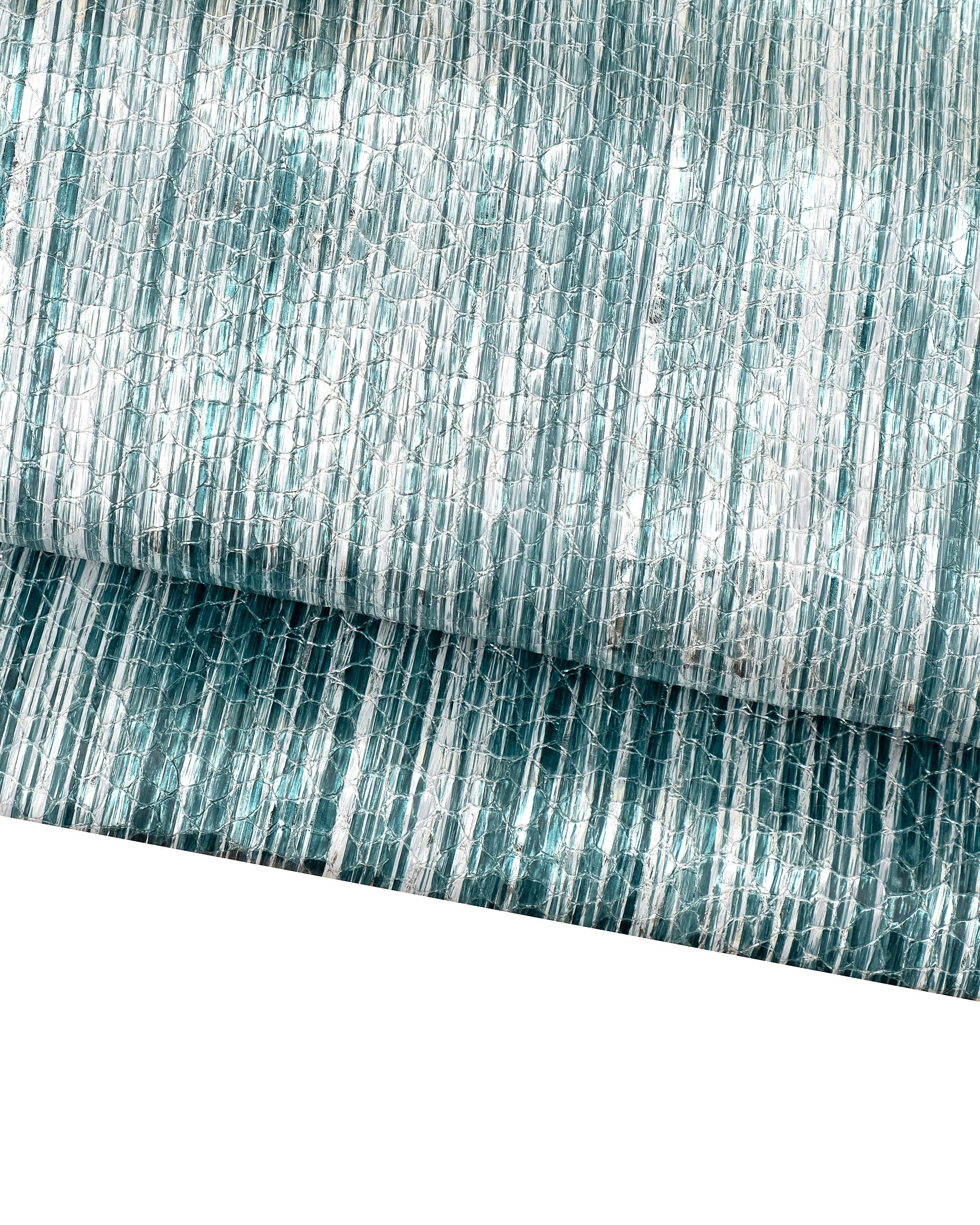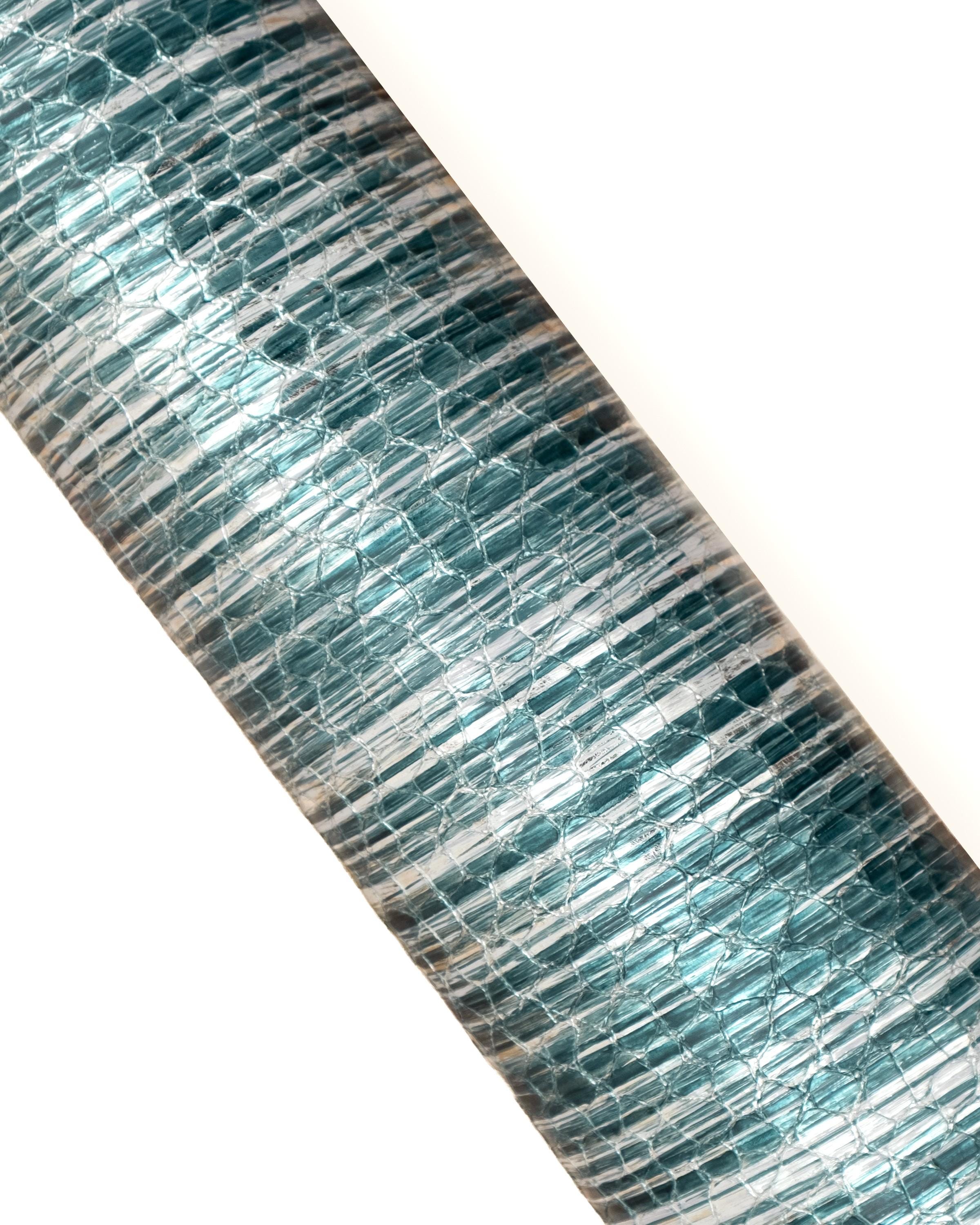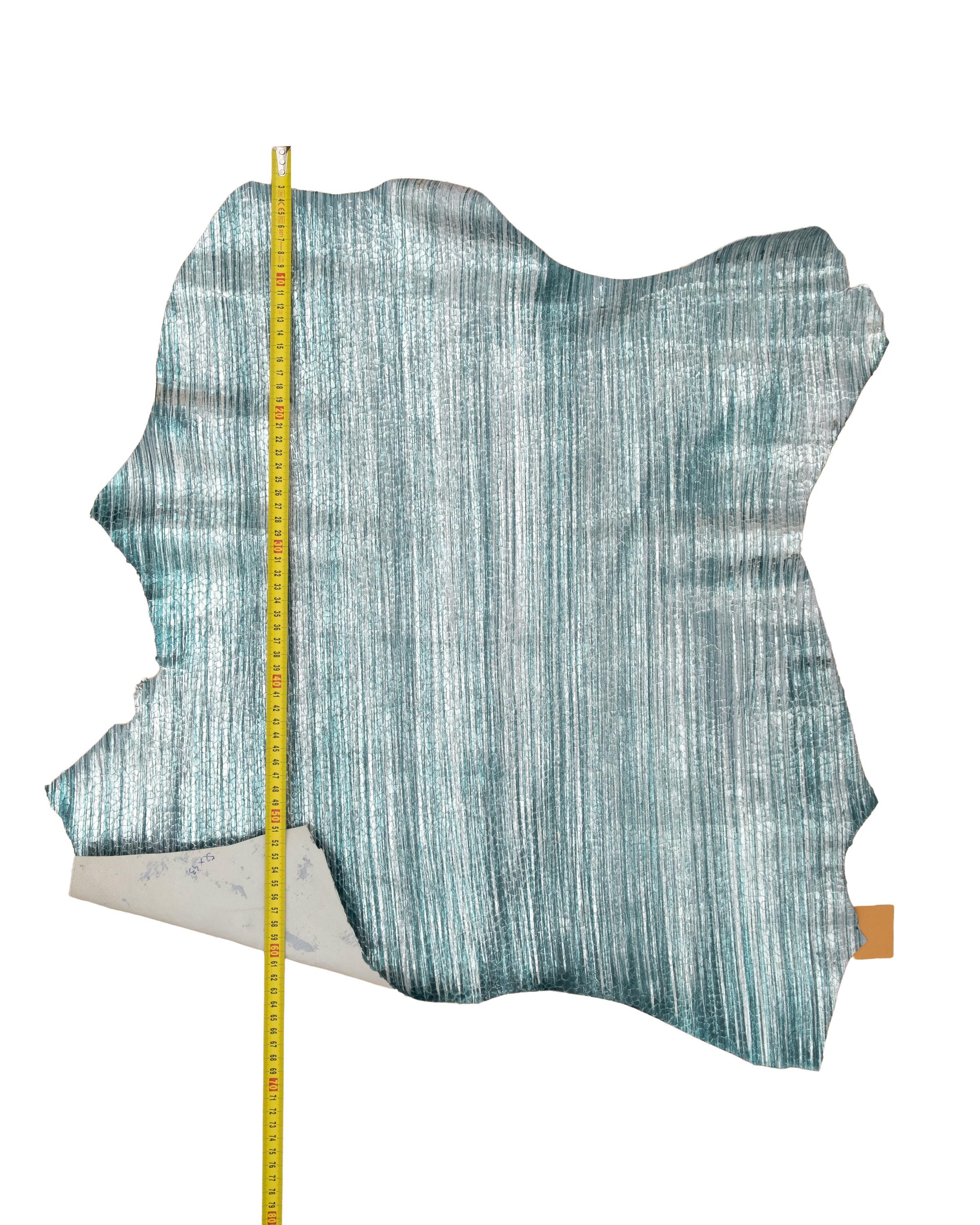 Stunning soft goatskin leather in turquoise color with glossy metallic finish and reptile print effect, perfect for leathercraft and accessory making.