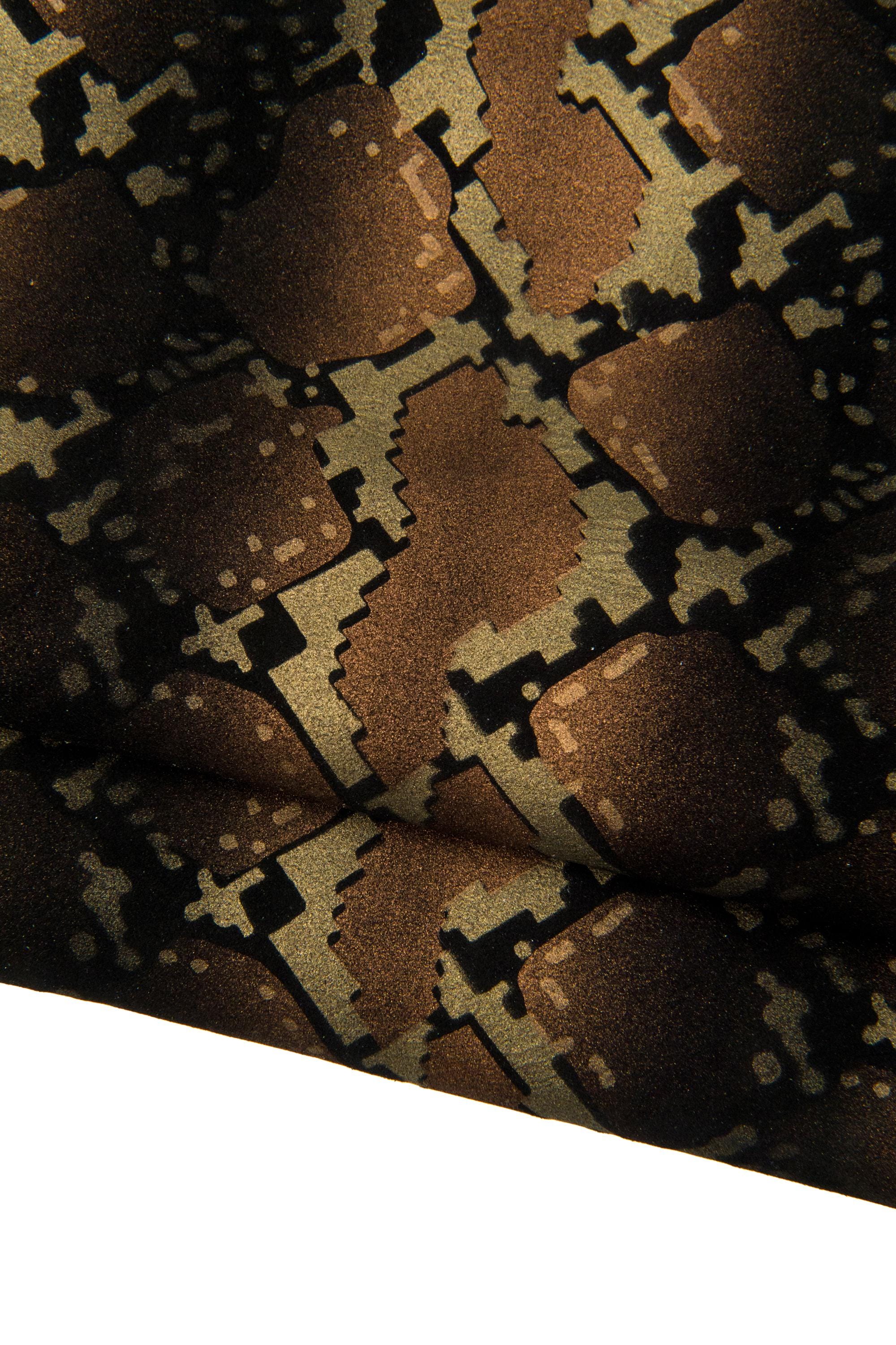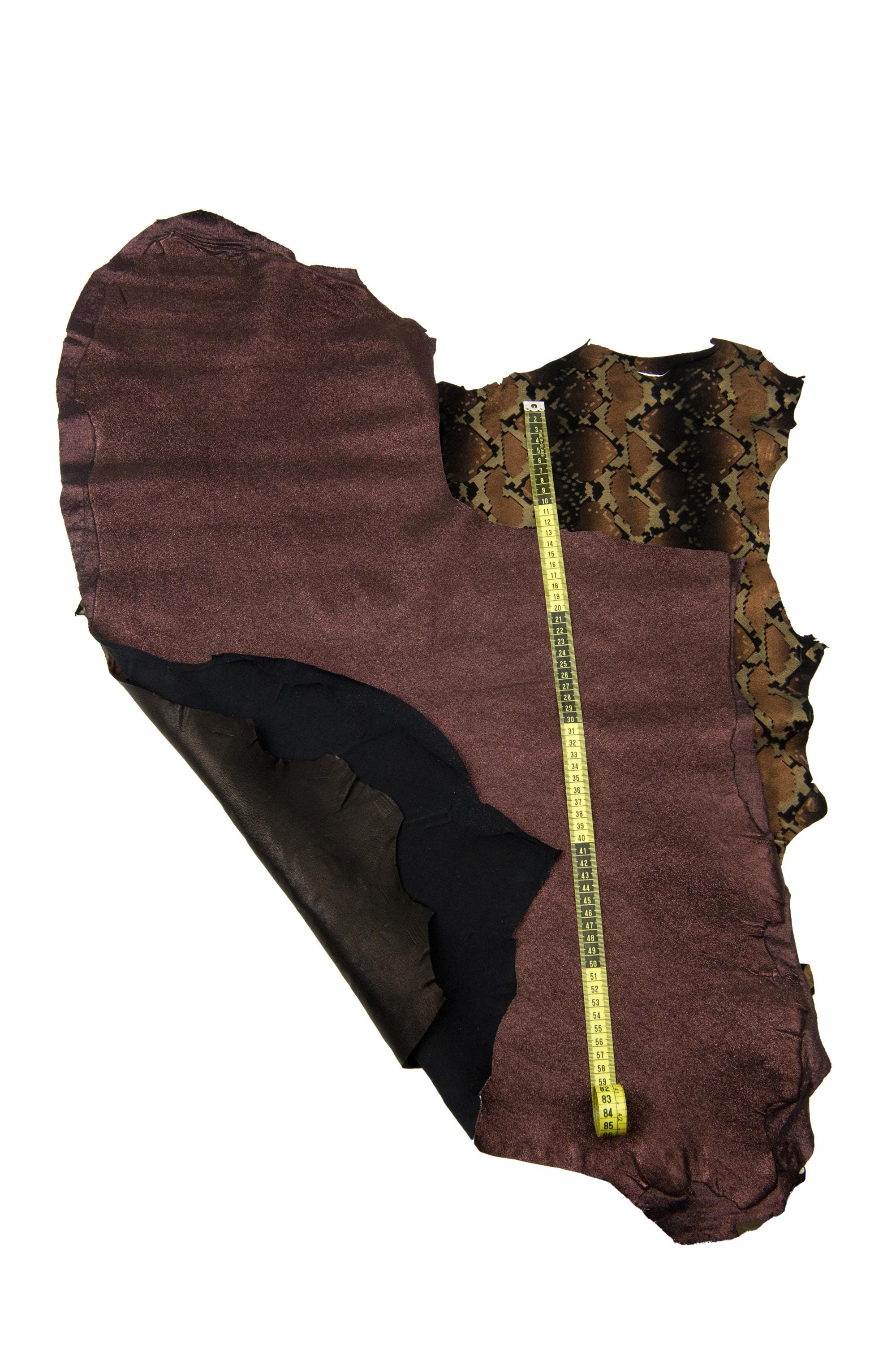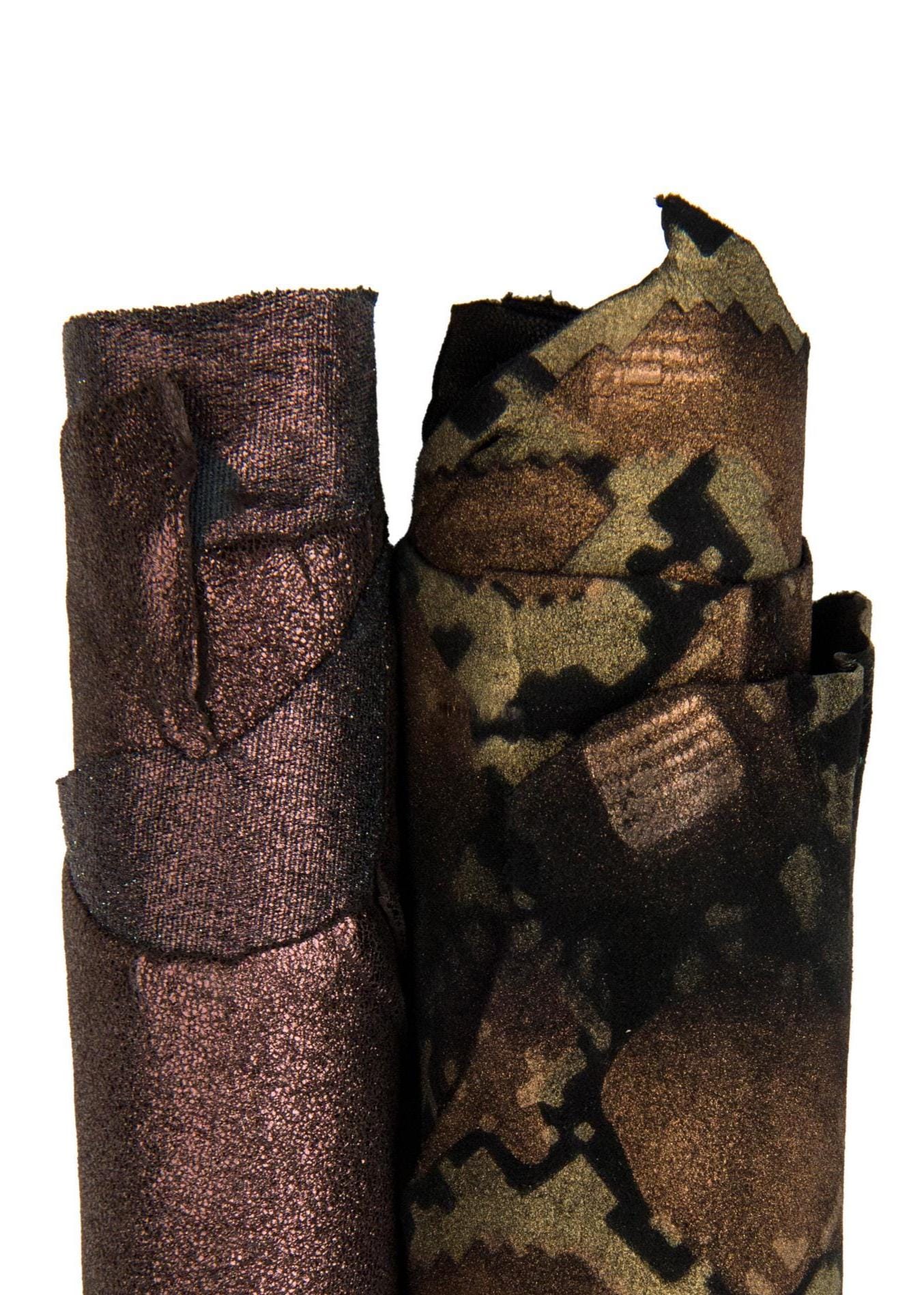 Beautiful ot of 2 brown matching leather hides, metallic elasticized and suede python printed goatskins as per pictures, ideal for DIY.