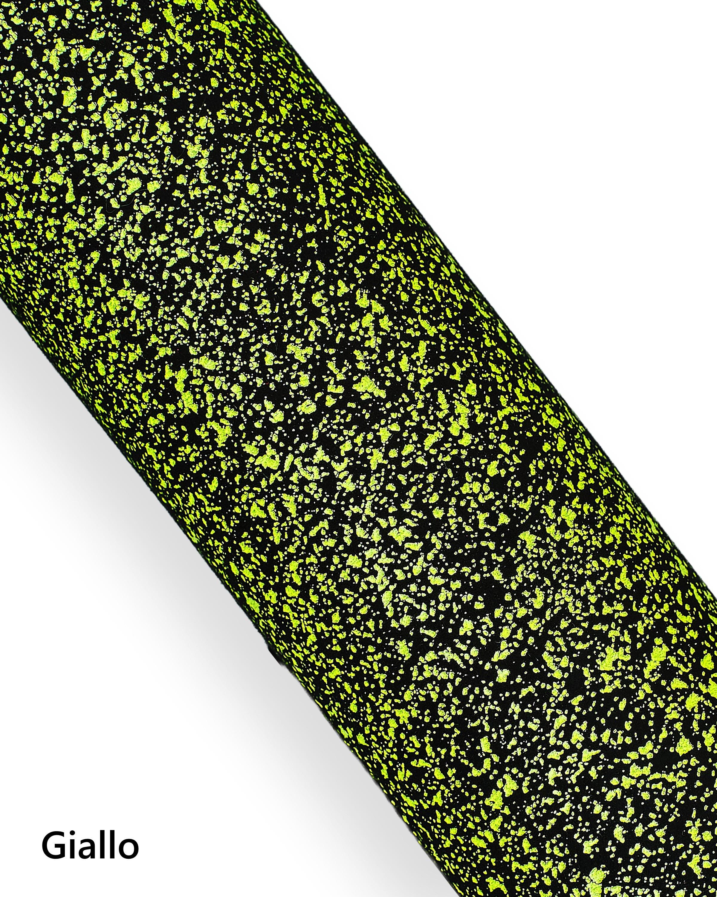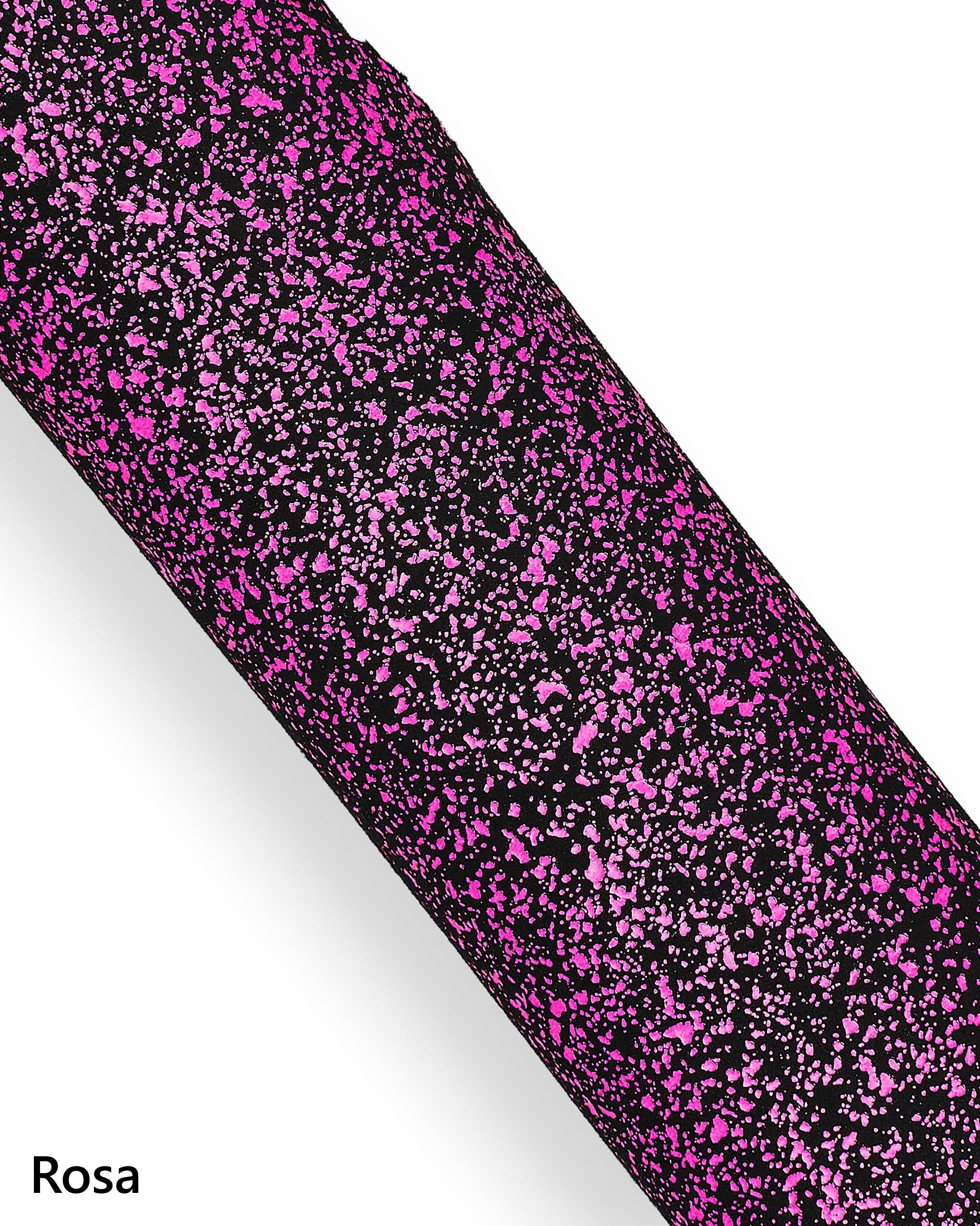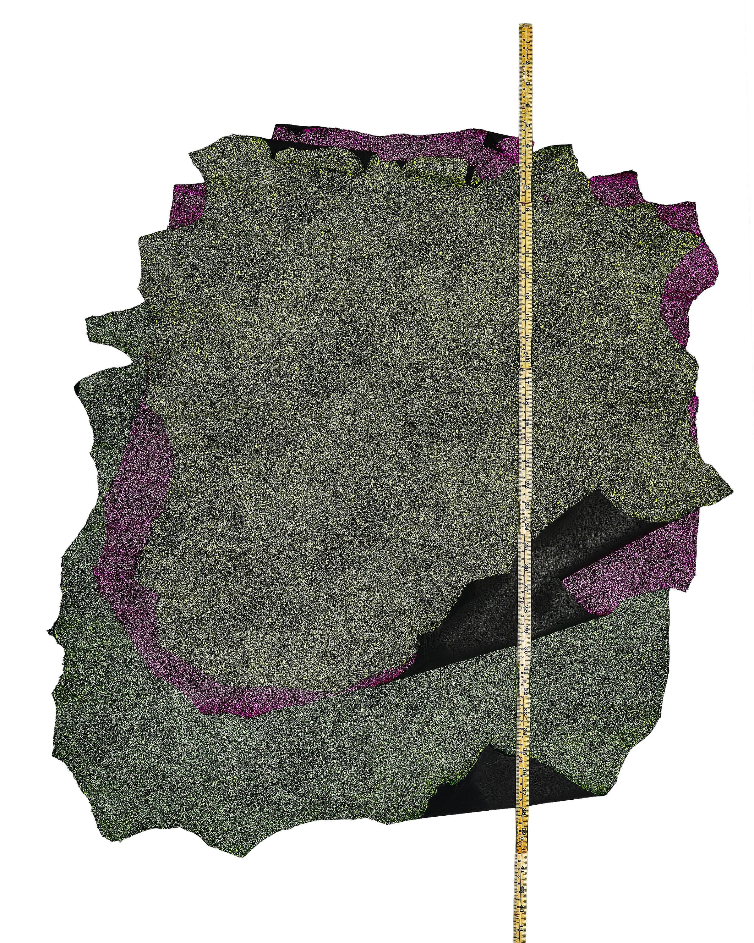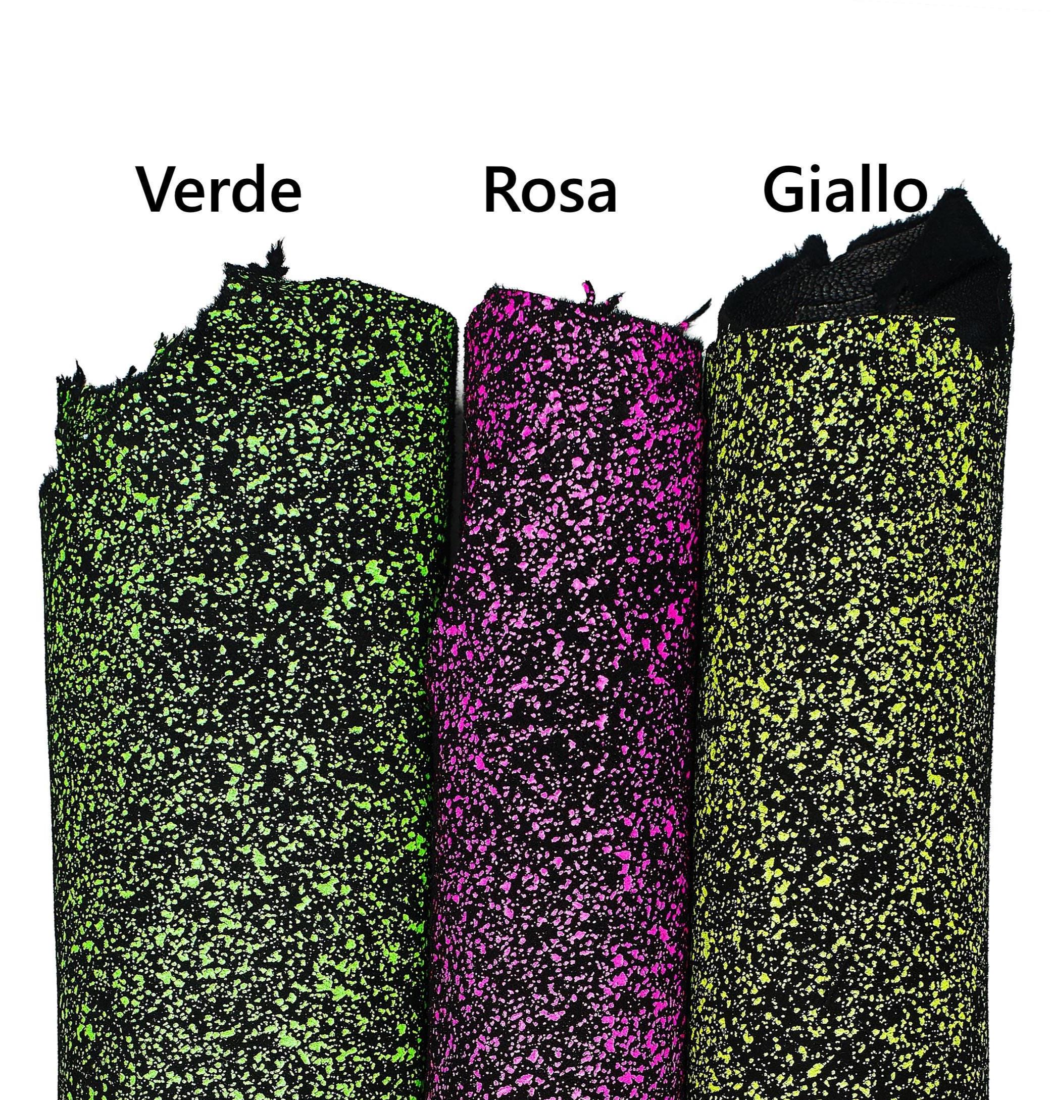 Unusual neon print on leather suede skin, fluo pink - yellow - green textured soft goatskin hide for hobbyists.