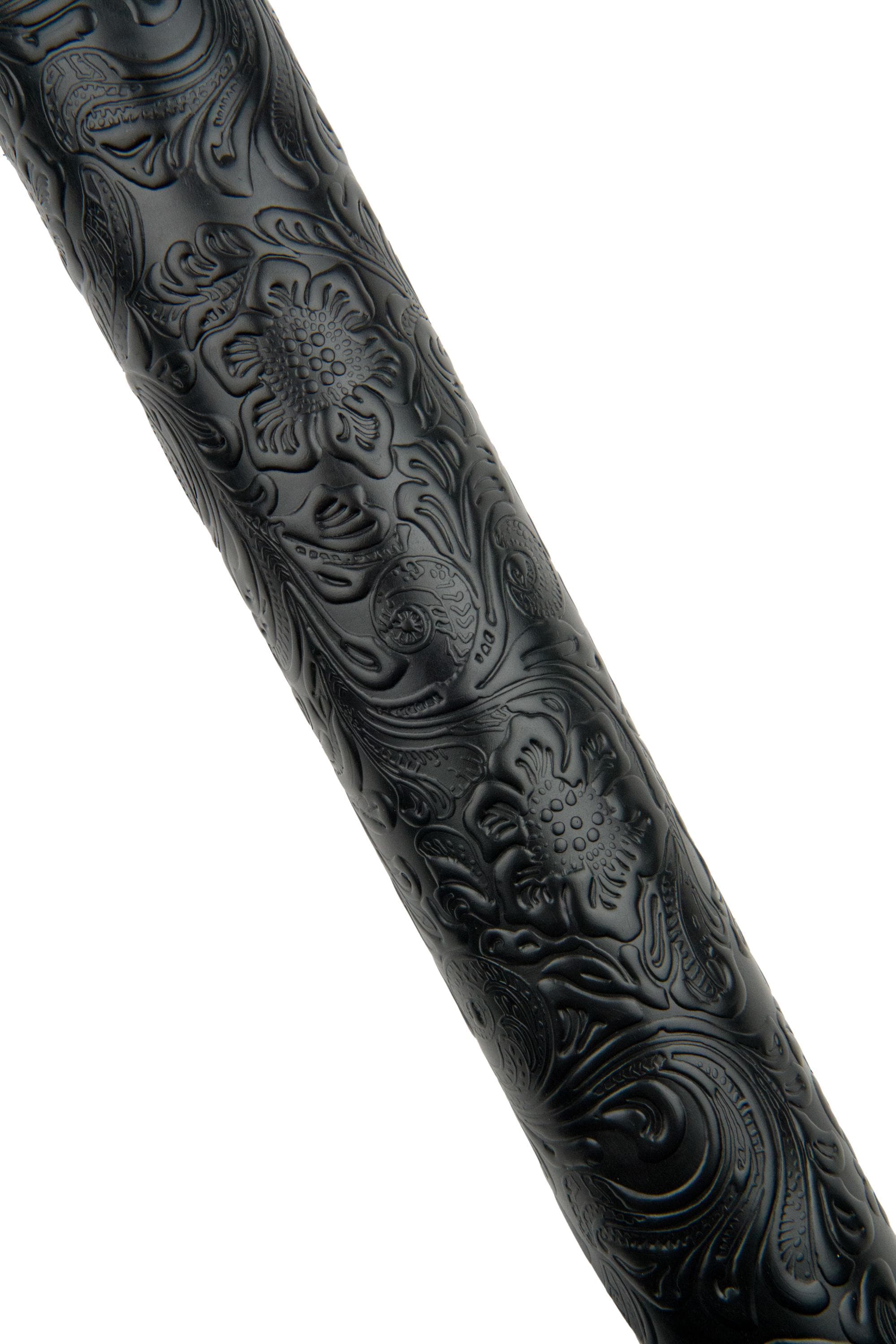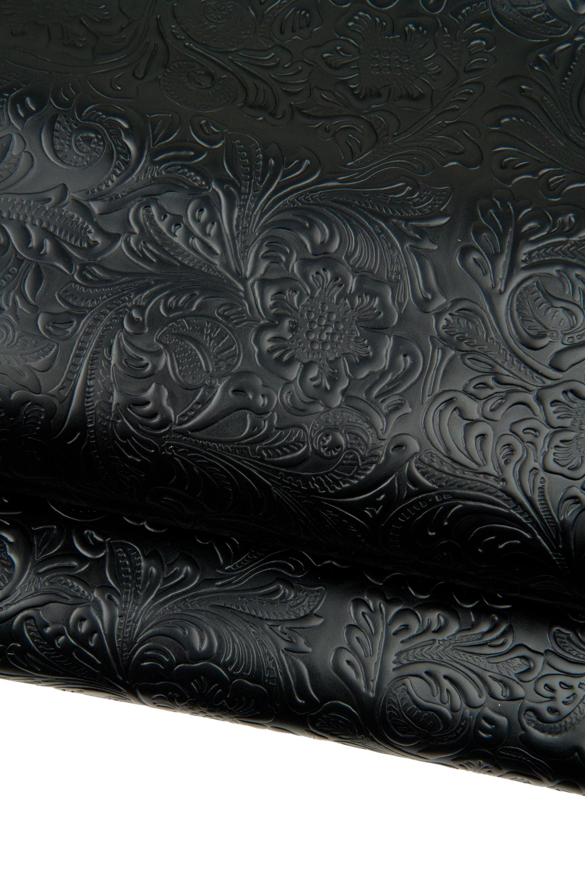 Incredible black floral embossed leather cowhide, charro flower print, relief texture on calfskin for DIY projects.