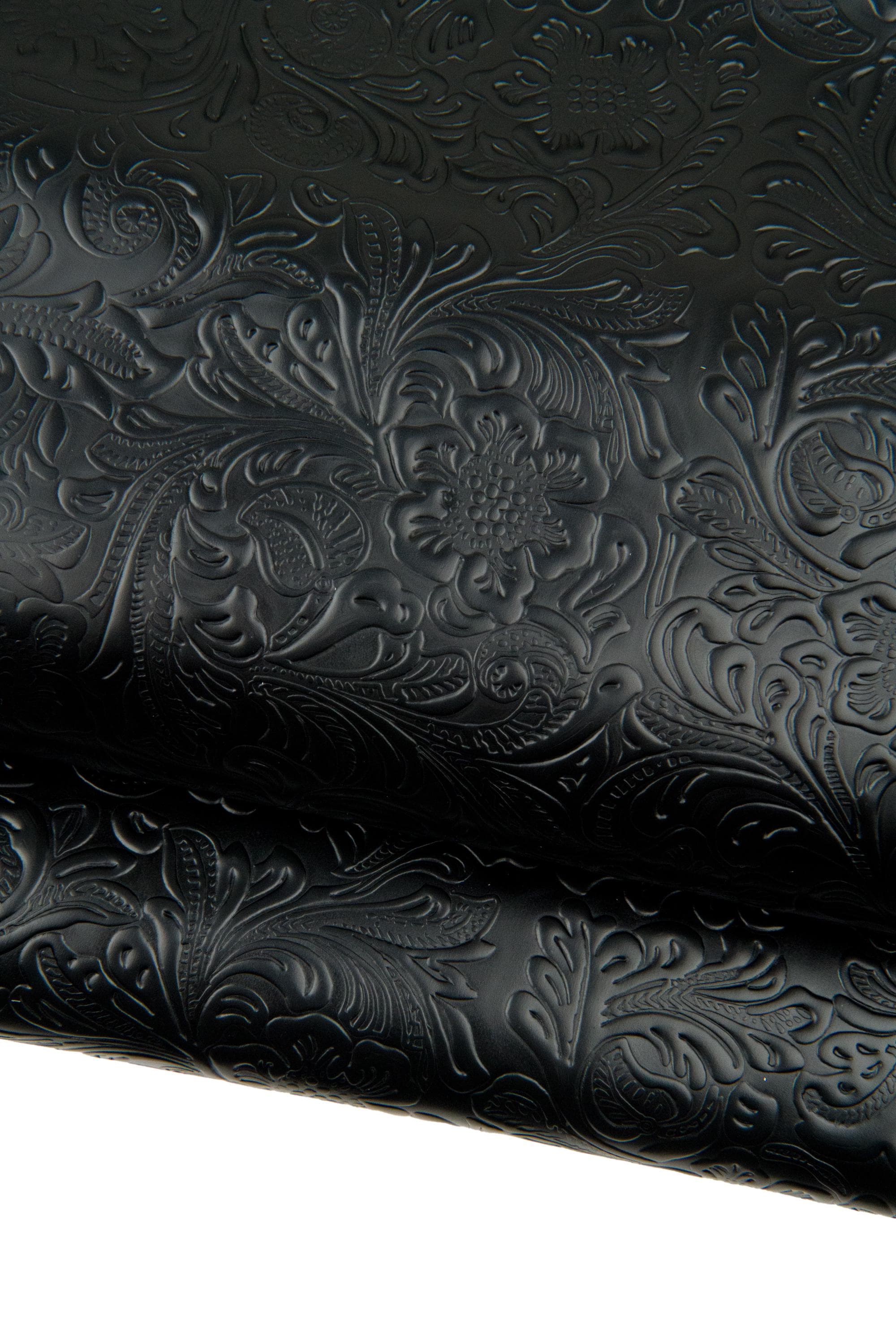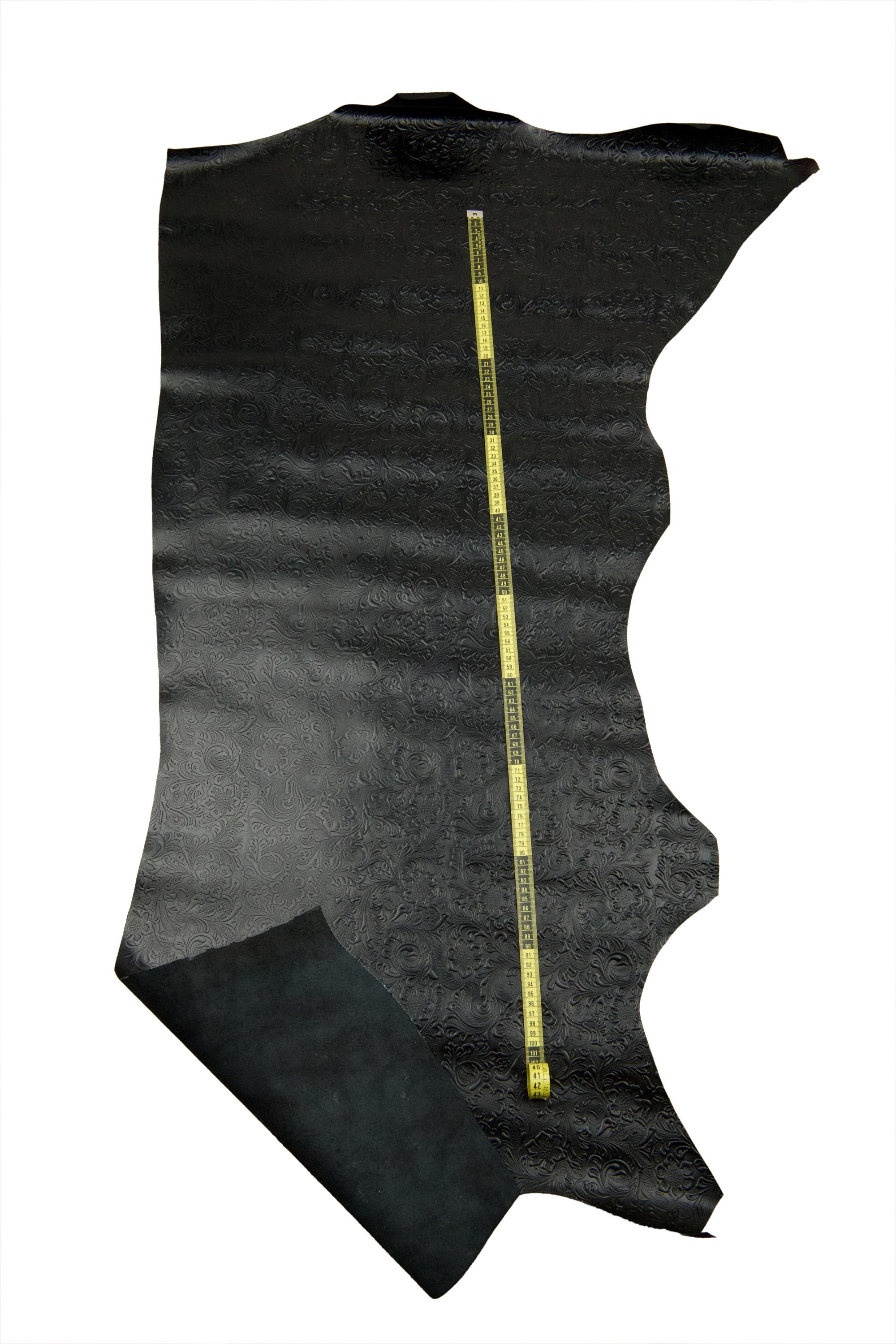 Outstanding black floral embossed leather cowhide, charro flower print in relief on calfskin, 0.8 - 1.0 mm.