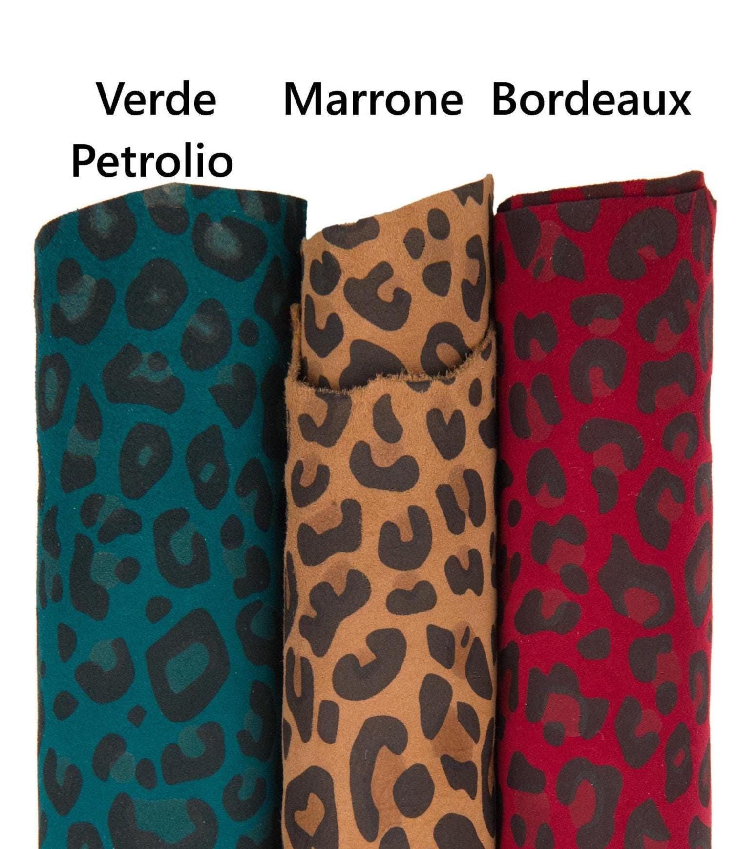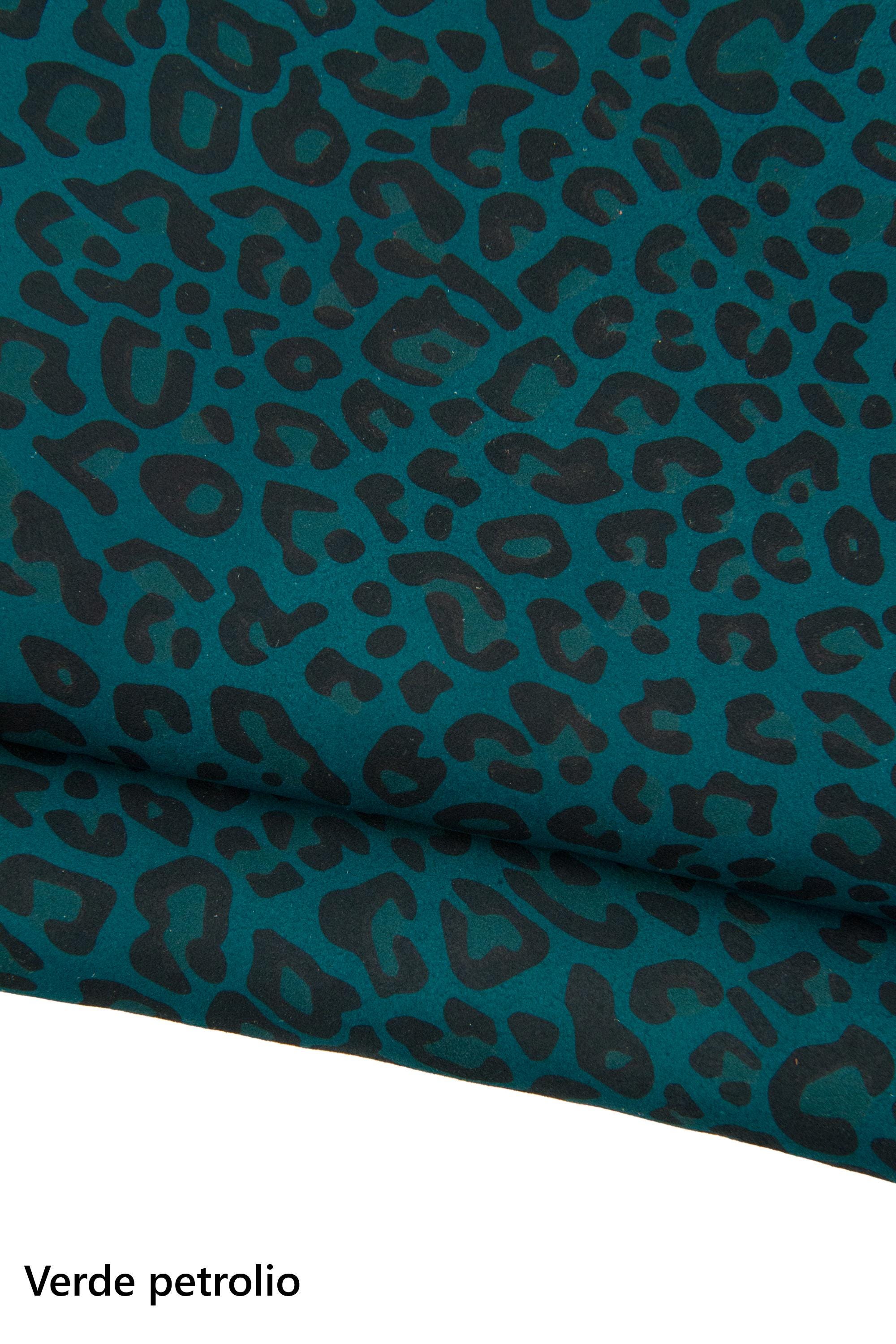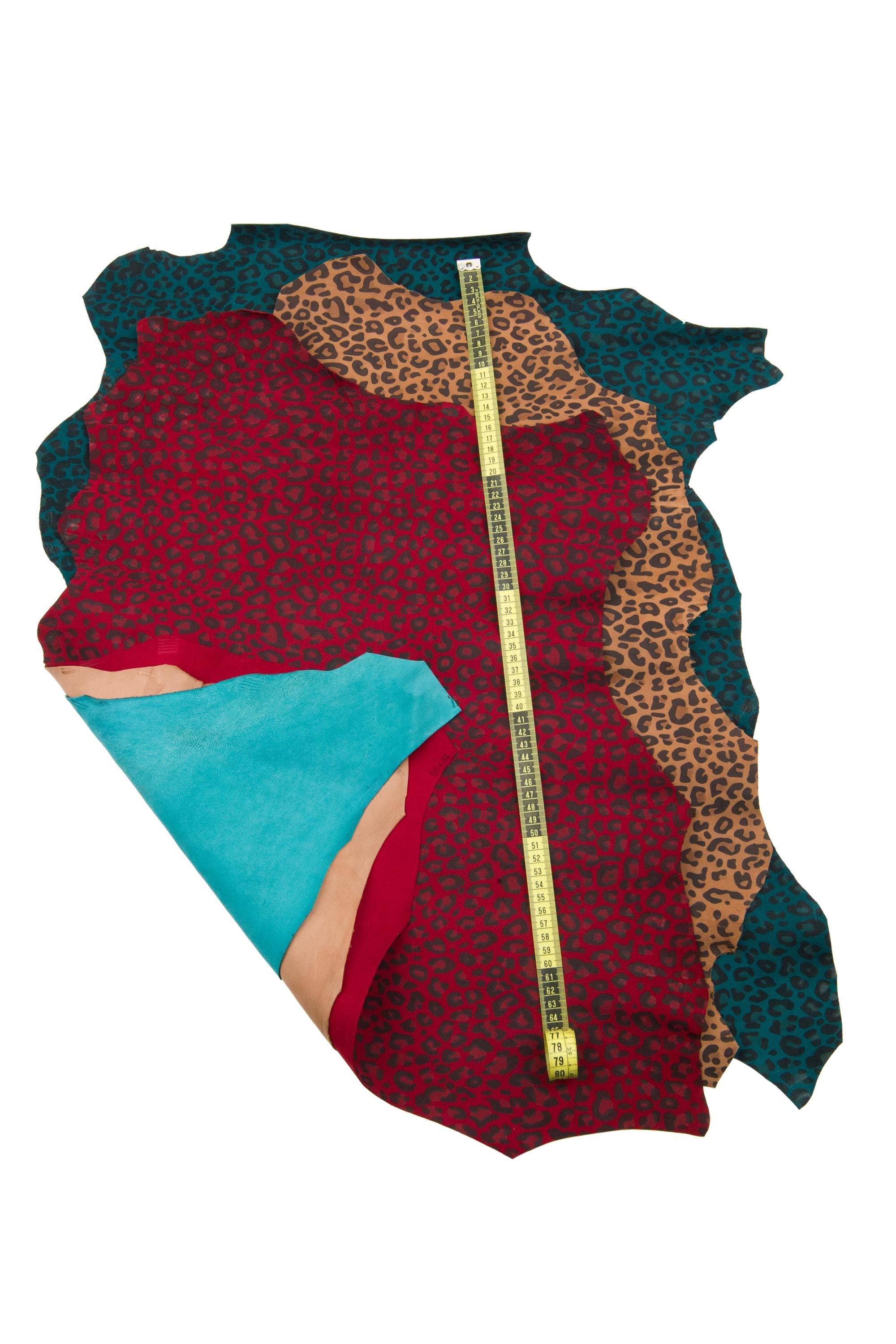 Stunning cheetah printed leather skin, leopard textured suede goatskin, animal pattern on petroleum green, brown , burgundy soft skin. Ideal for hobbyists.