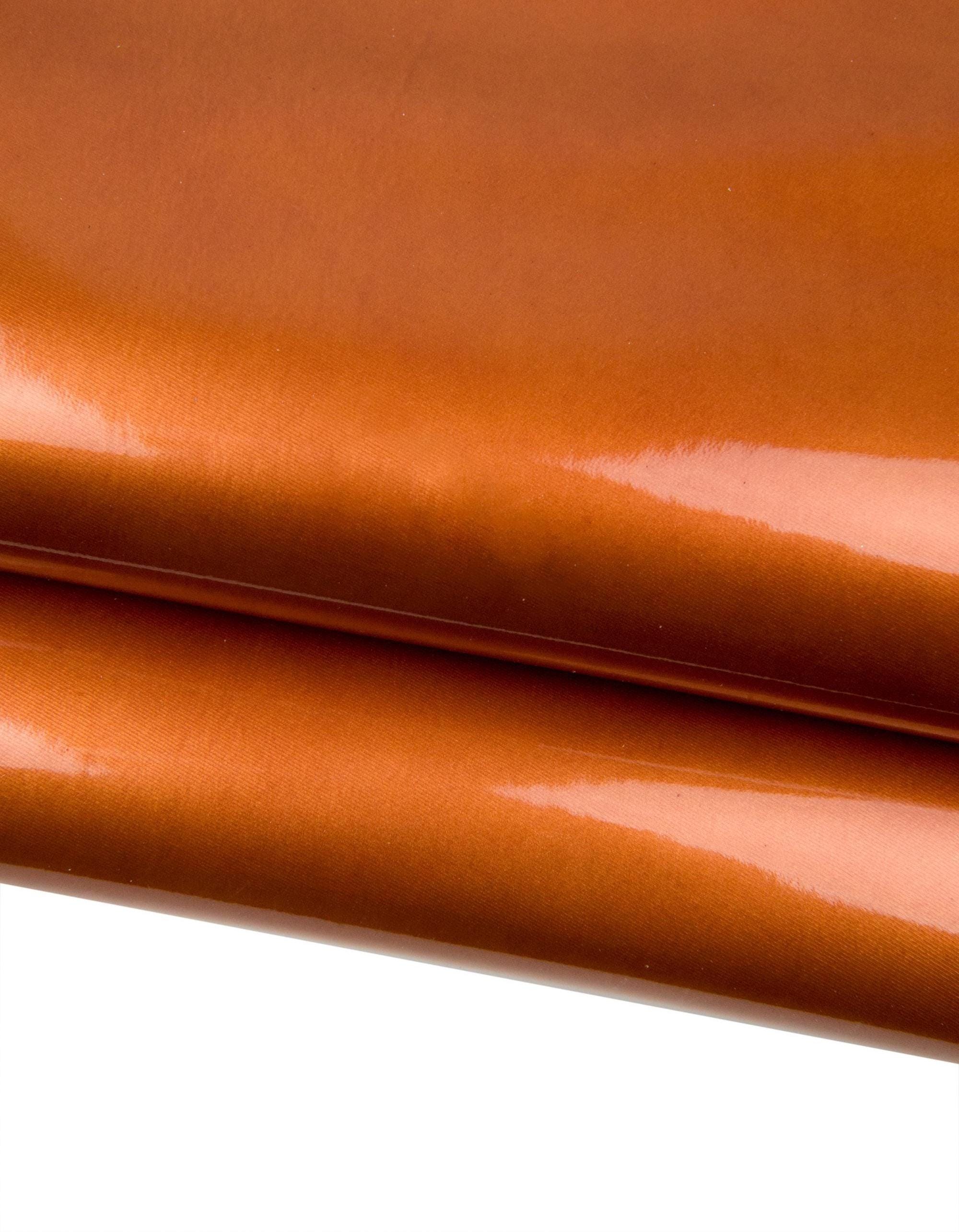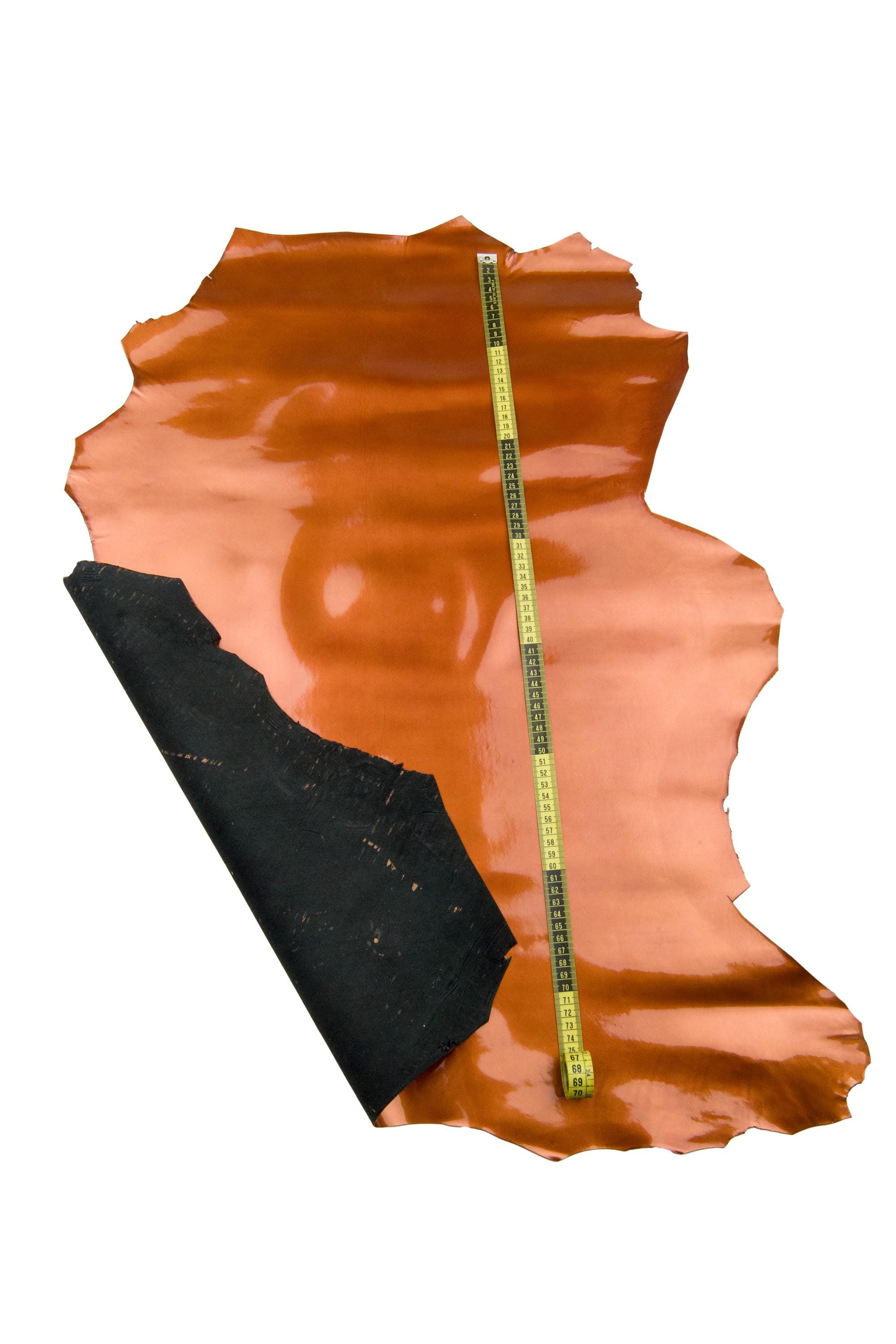 Stunning rust leather hide, patent goatskin, glossy and smooth, medium softness, ideal for DIY projects.