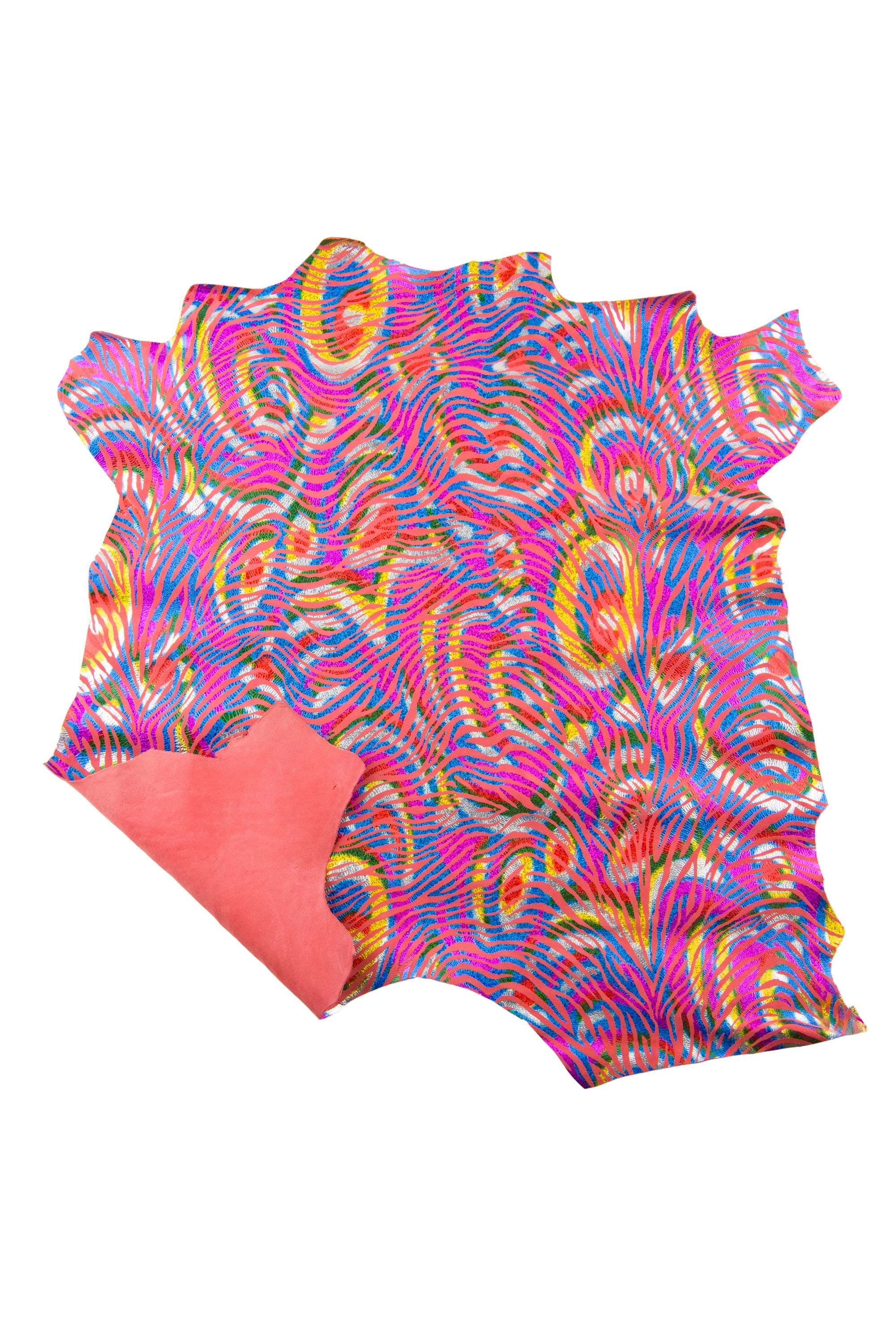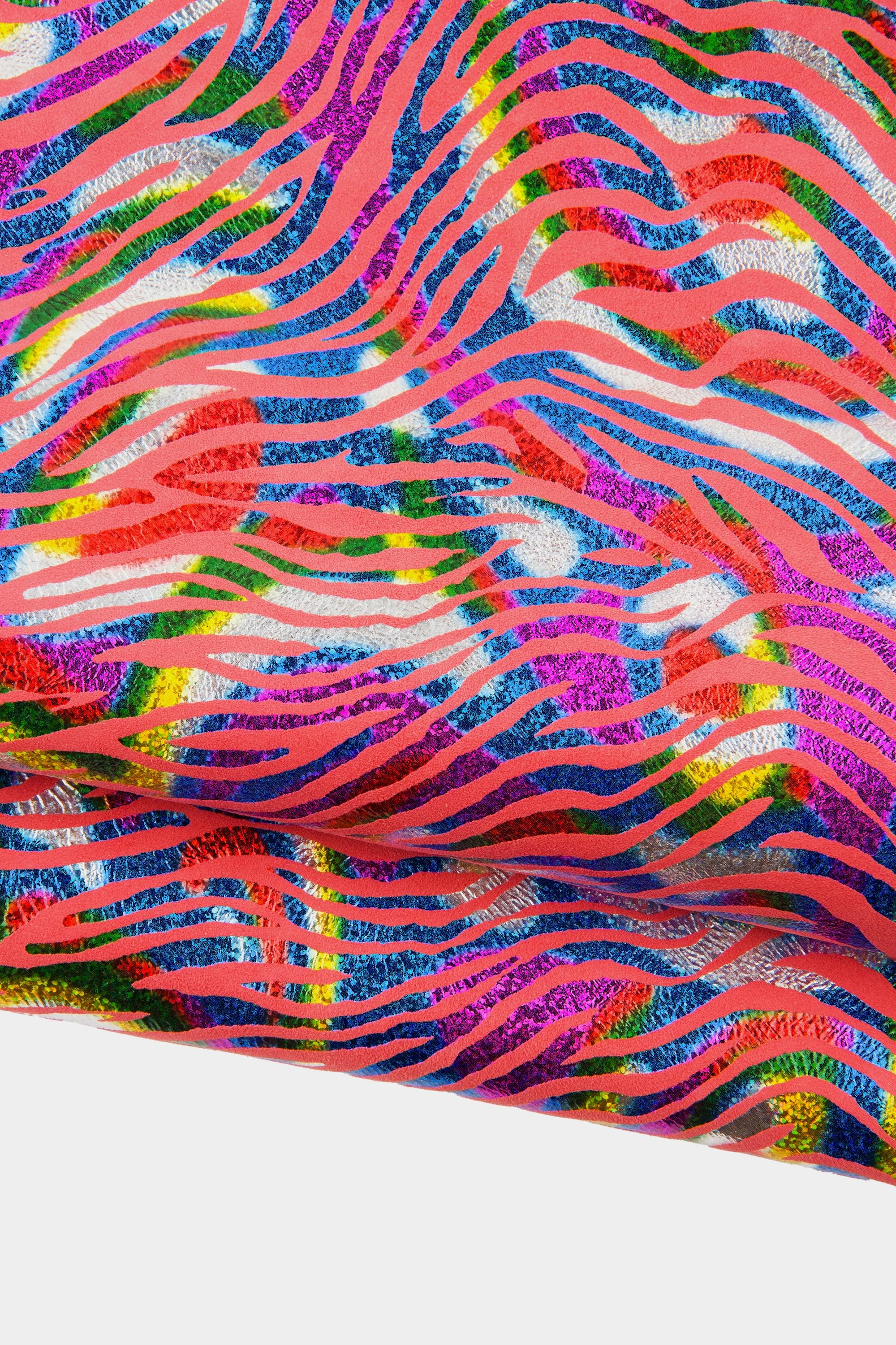 Stunning multicolor holographic metallic zebra printed on pink suede goatskin, bright and soft.