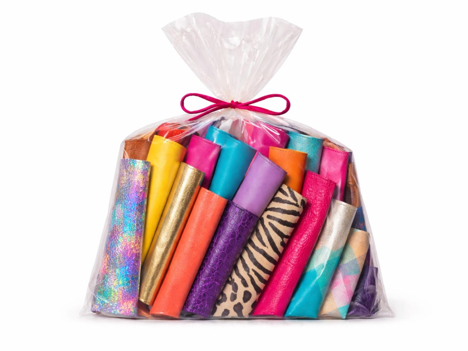 This assortment features solid color laminated leathers with bright, metallic, glossy finishes. Pieces are randomly selected and include both smooth surfaces and textured grain leathers, creating a visually rich and creative combination.