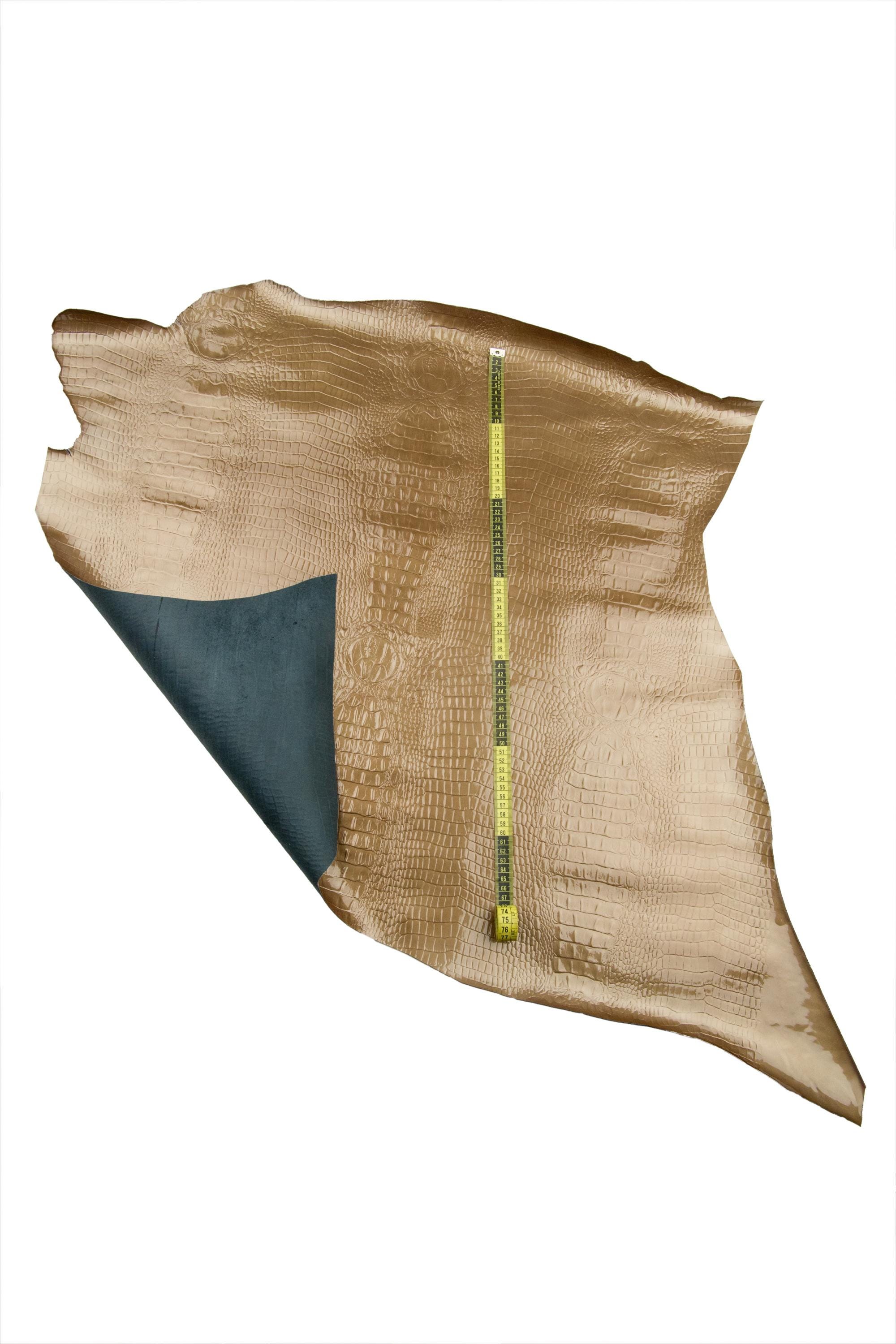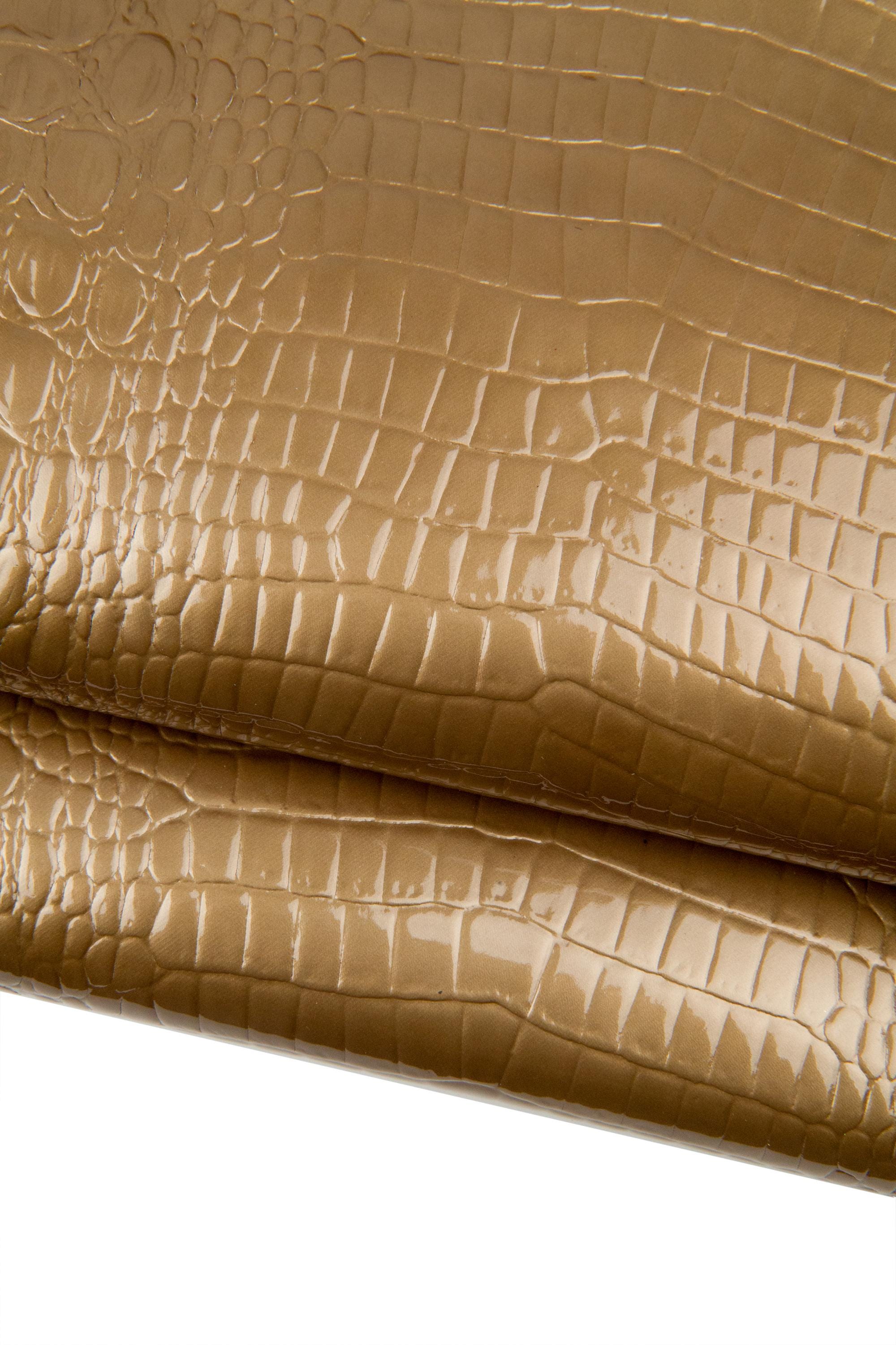 Fantastic beige pearlized patent leather hide, crocodile embossed calfskin, glossy cowhide for crafters, standard temper.