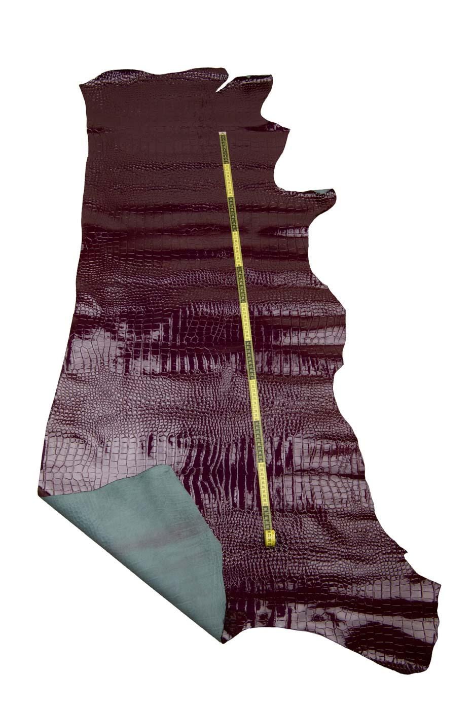 Incredible burgundy crocodile embossed leather hide, alligator print on patent calfskin, glossy cowhide for crafting.