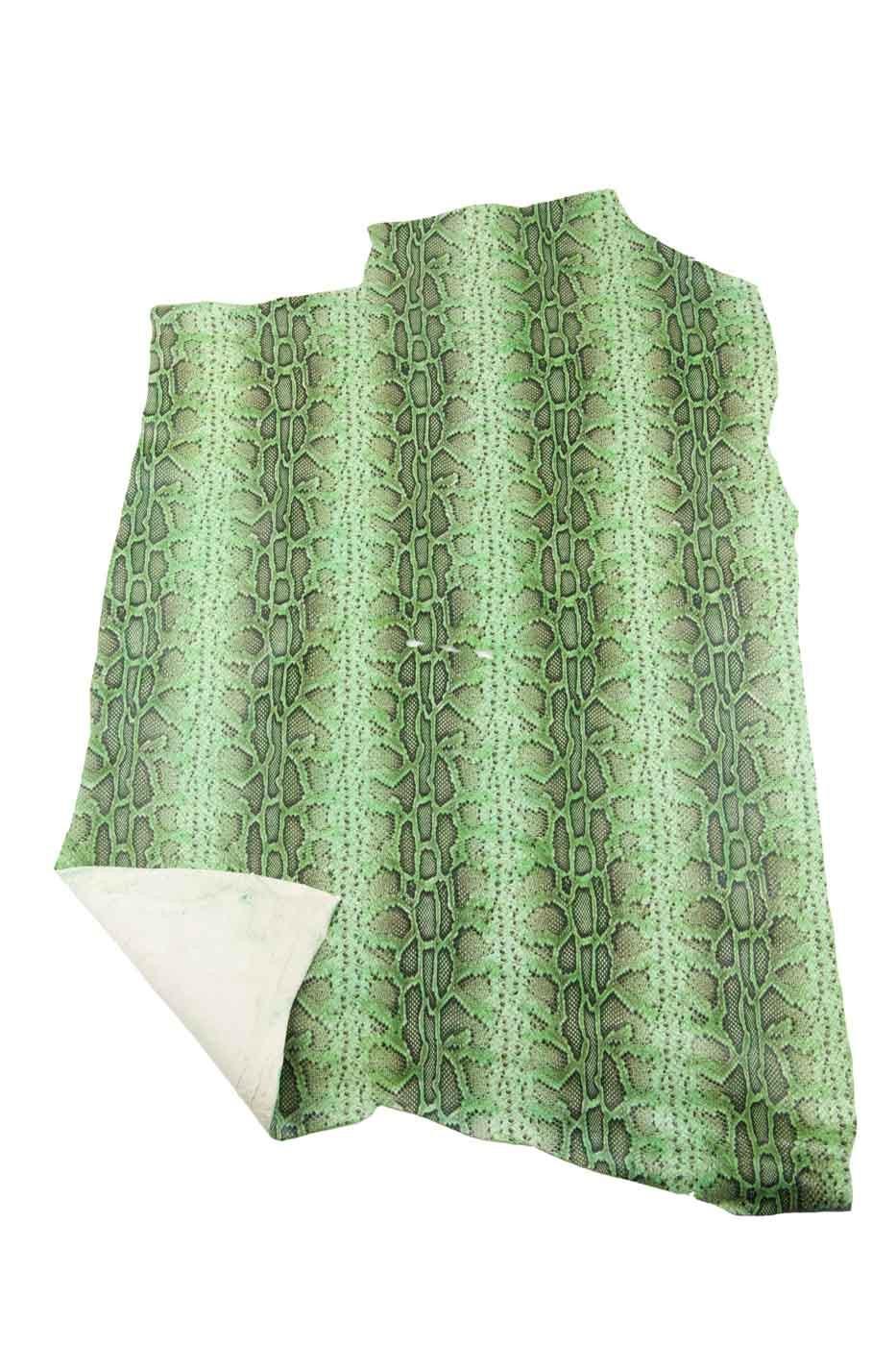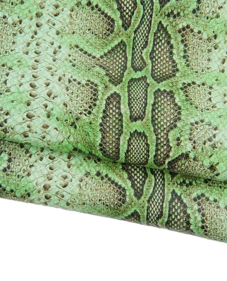 Stunning green - black python textured leather hide, glossy reptile printed cowhide, snake pattern on soft calfskin, ideal for crafters.