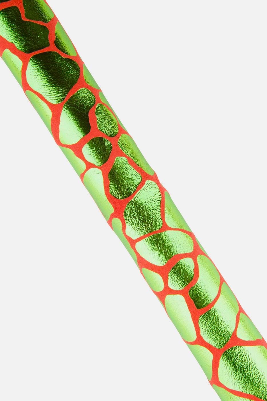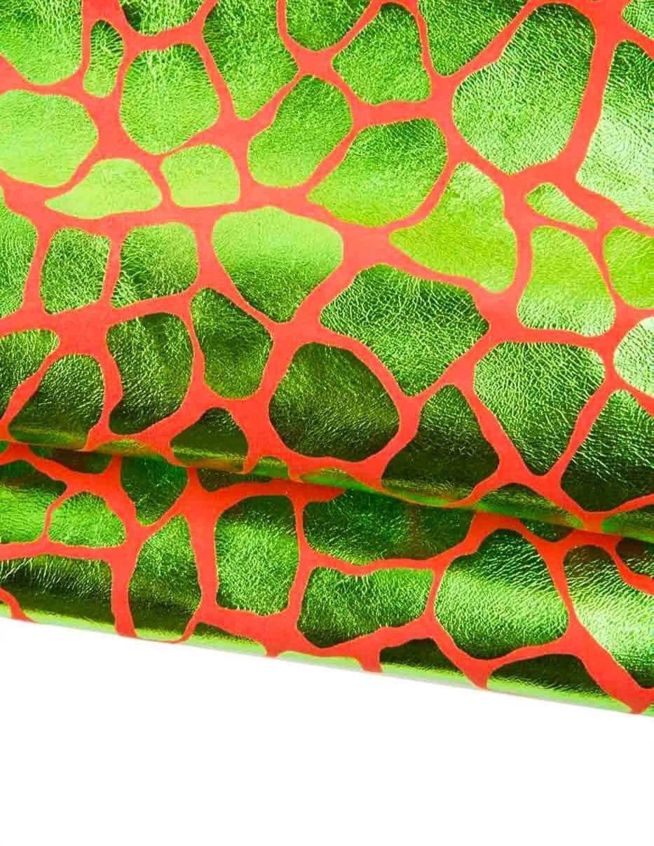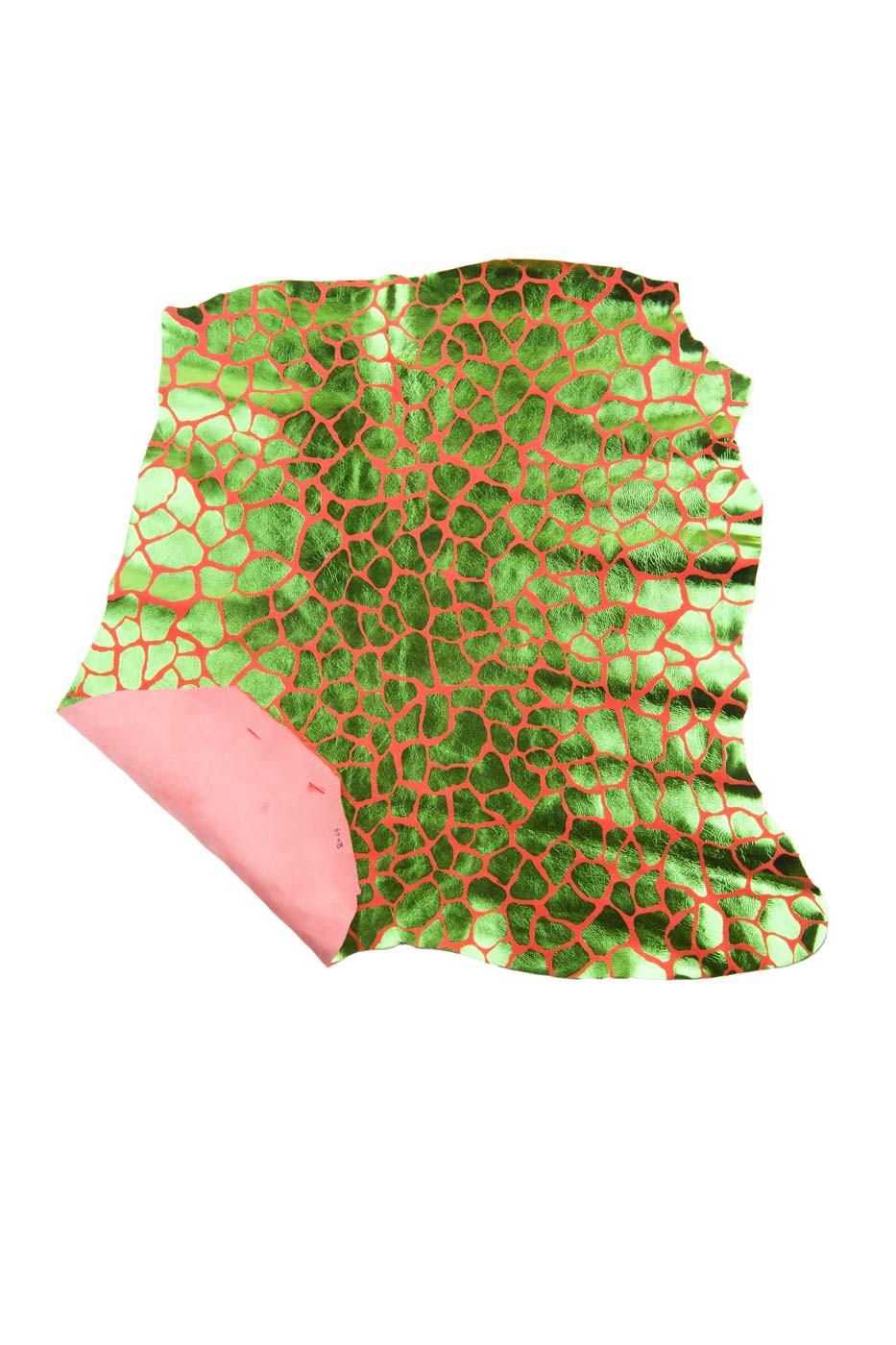 Wonderful green metallic giraffe textured goatskino on red suede, very bright for your creations.