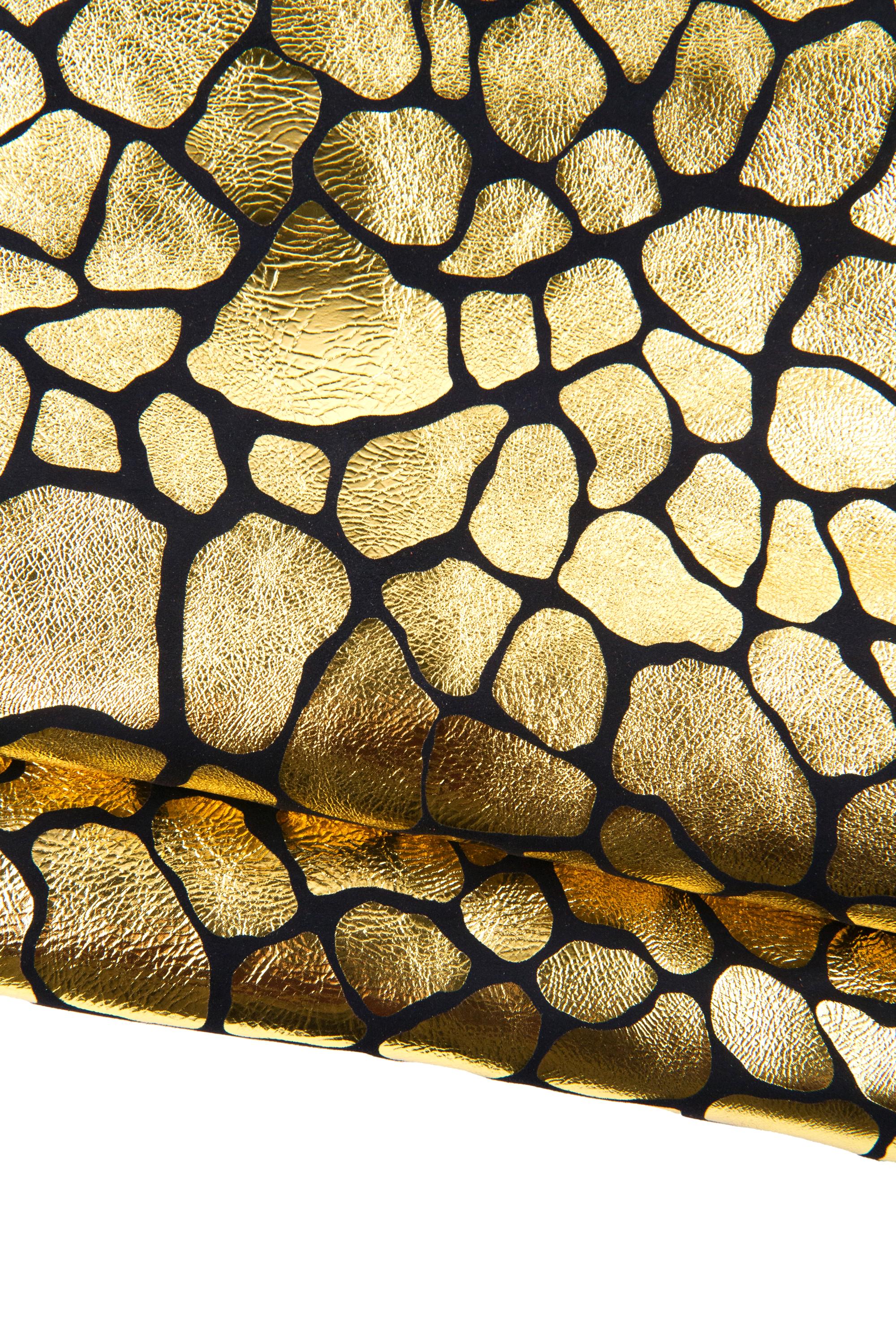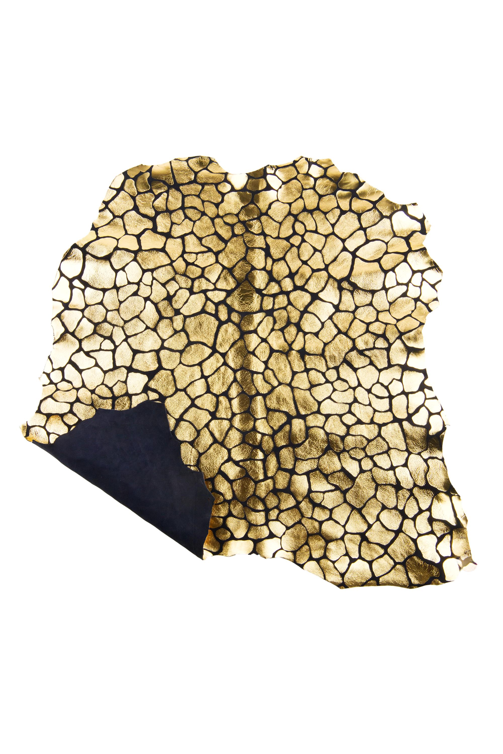 Wonderful gold metallic giraffe textured goatskin on dark blue suede, very bright for your creations.