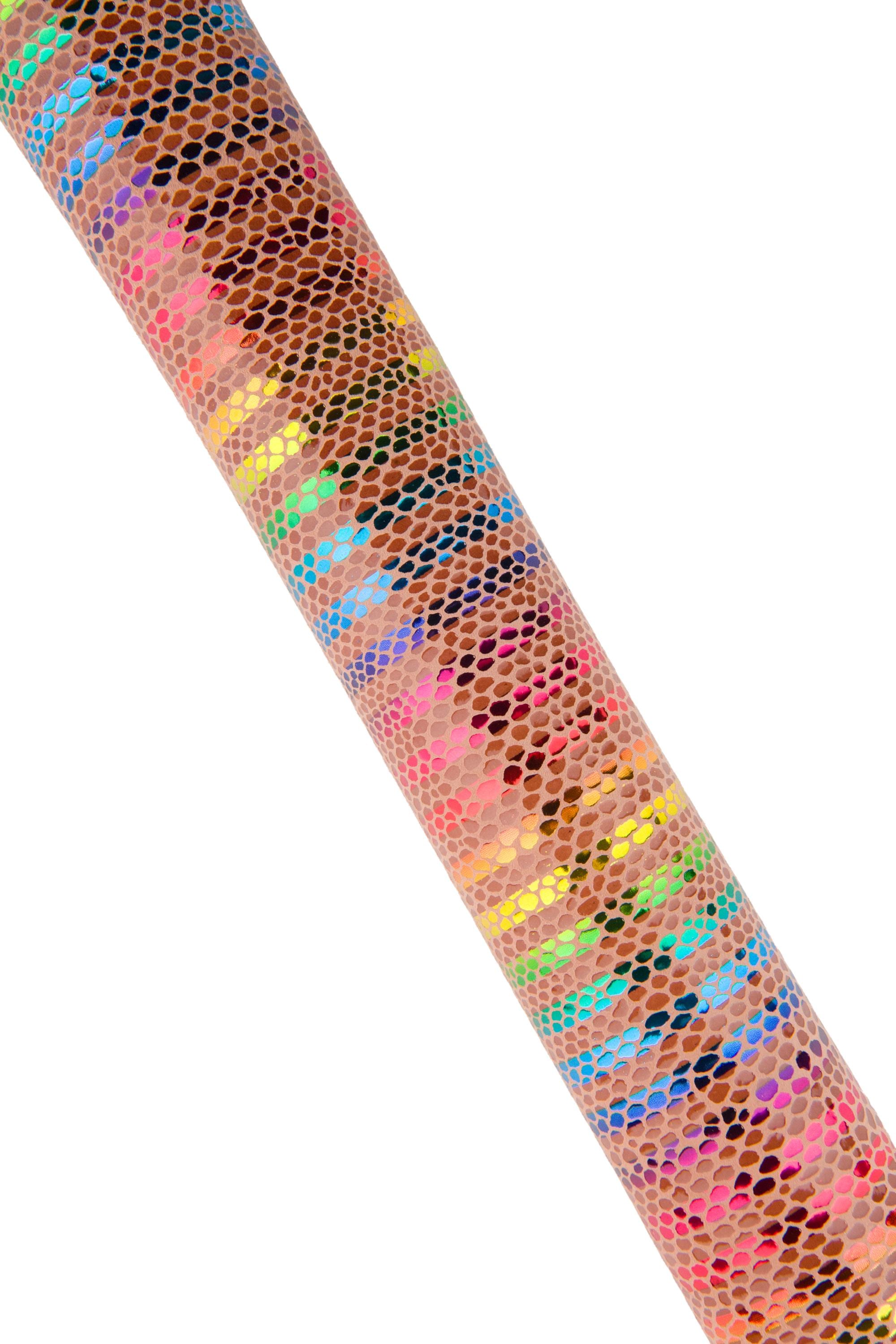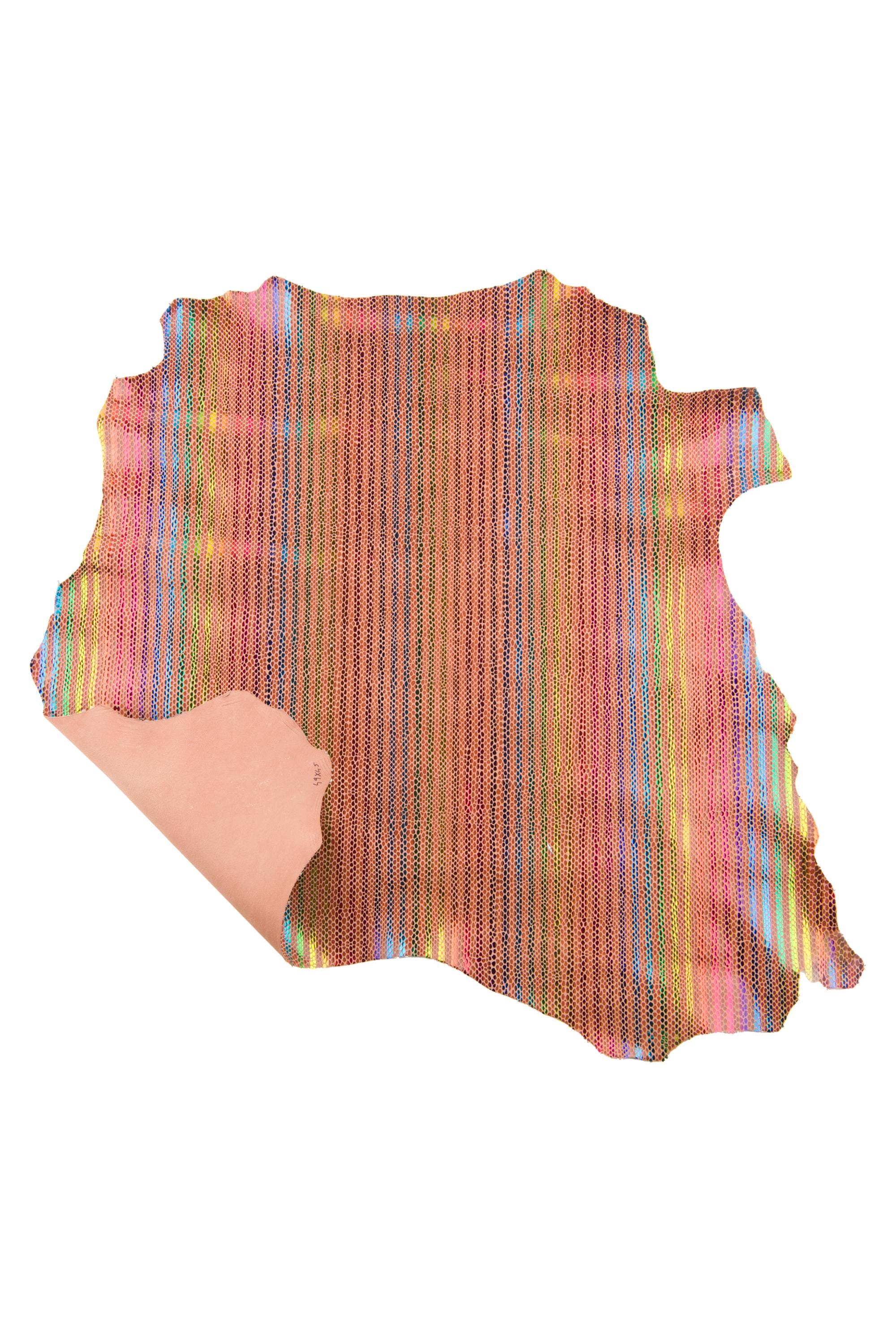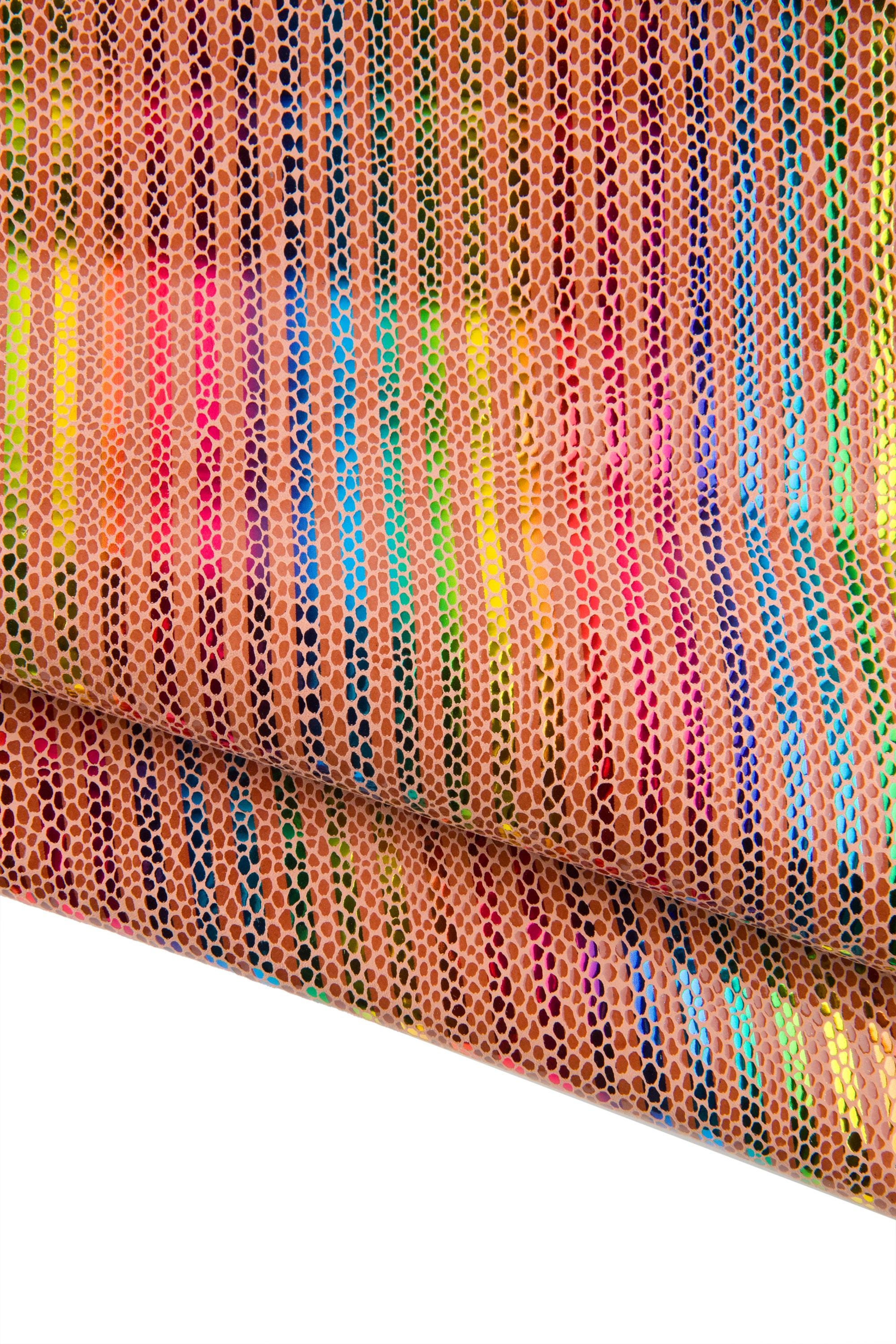 Special multicolor striped printed leather skin, tan snake textured goatskin, rainbow textured hide for DIY projects.