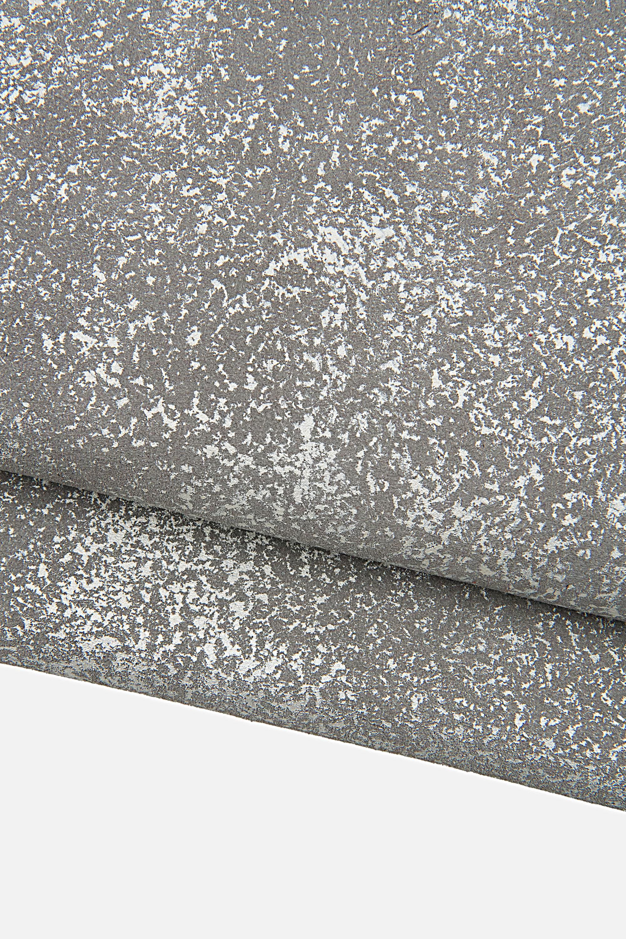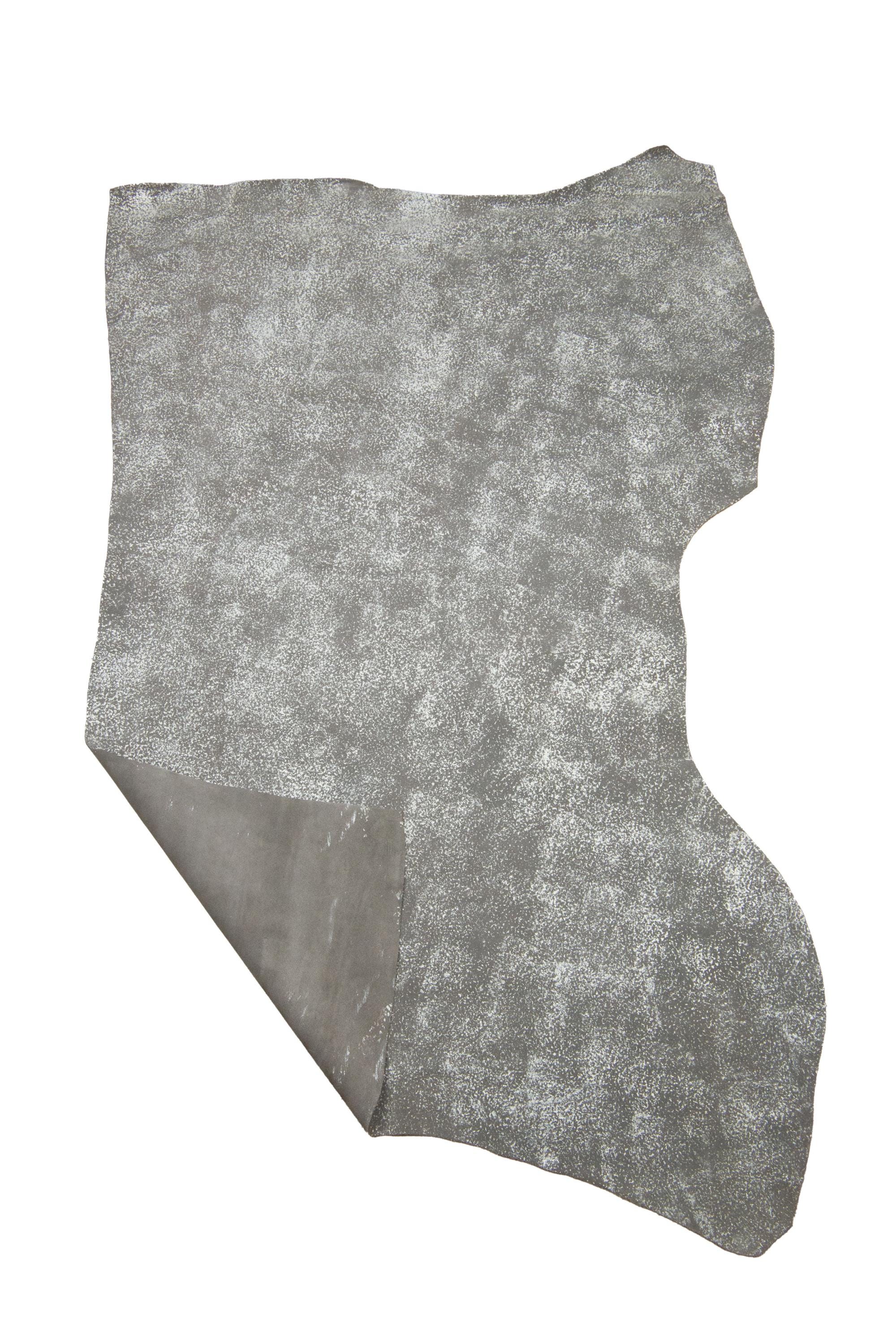 Fabulous grey cowhide leather with silver pearlized print, soft textured split cowhide, printed suede calfskin for crafters.