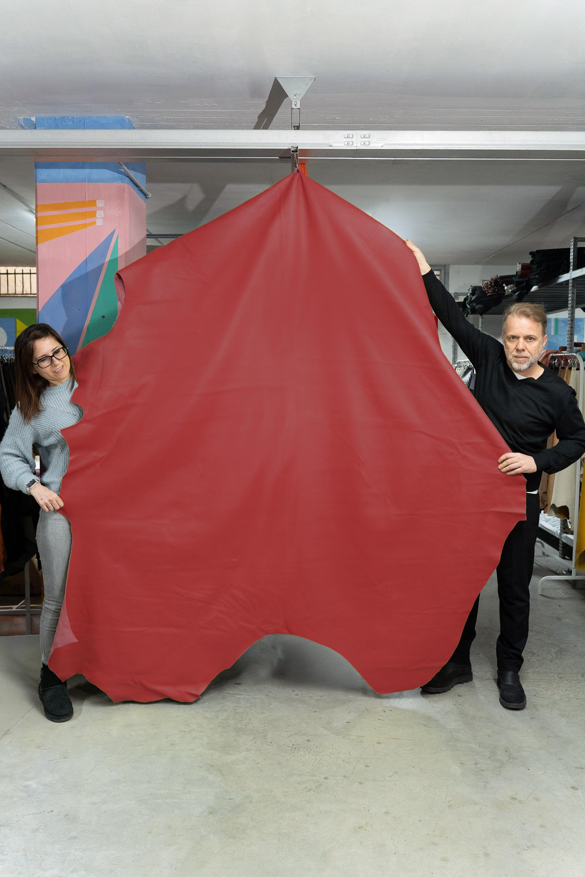 Full calf italian genuine leather cow hide in red tone with compact natural grain, suitable for upholstery chairs, sofas and armchairs, contract furnitures, sofas, cars and yachts, also structured handbags.
