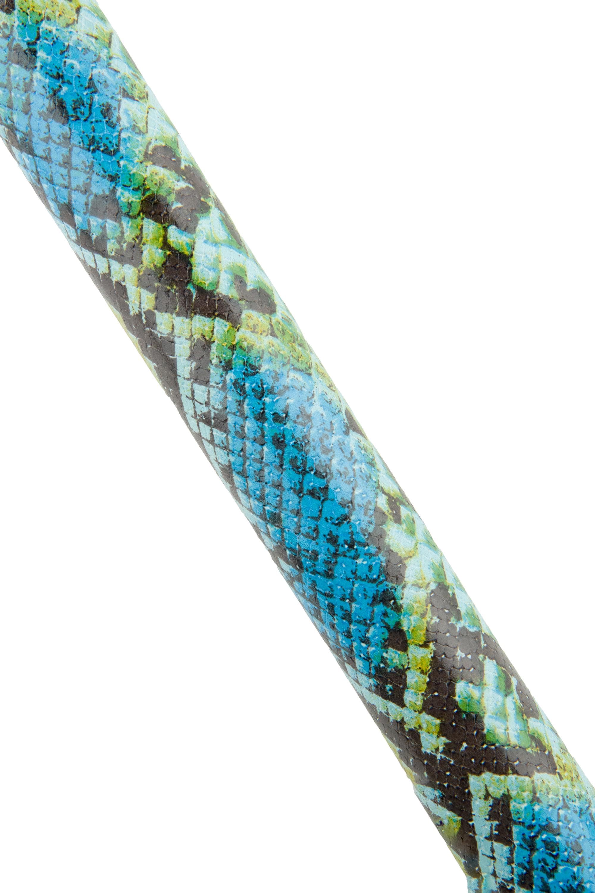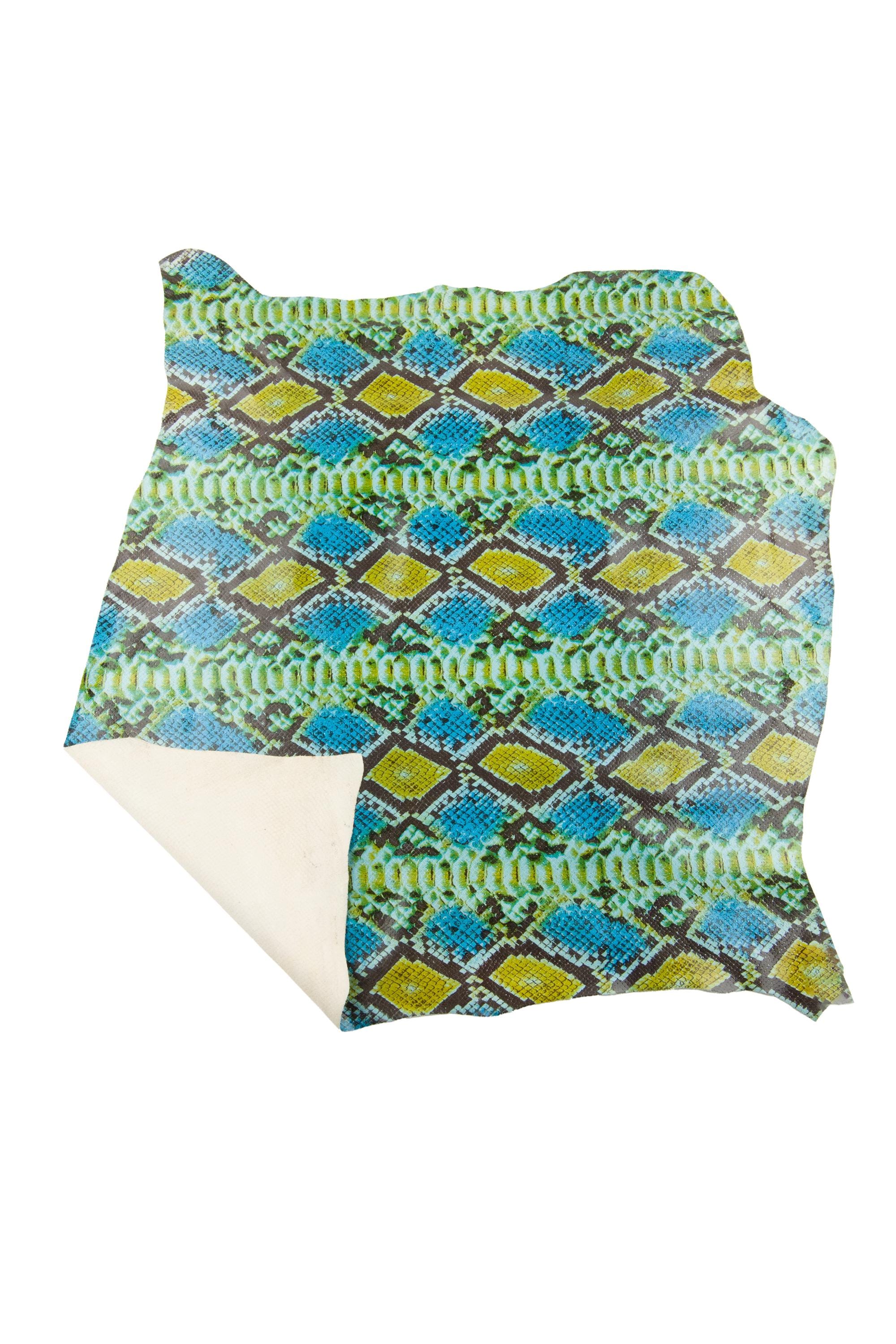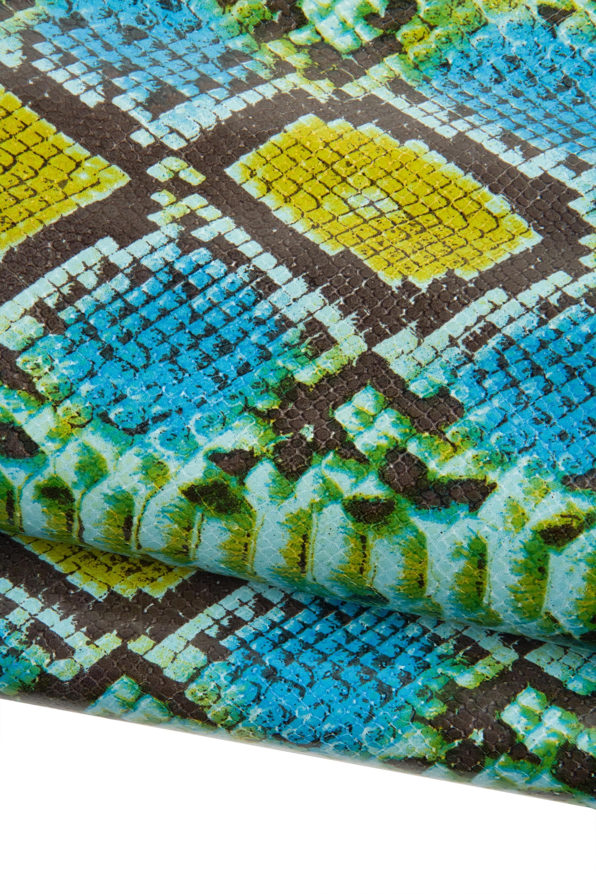 Fabulous glossy snakeskin, blue - green - yellow python printed leather hide, reptile textured calfskin for diy projects.
