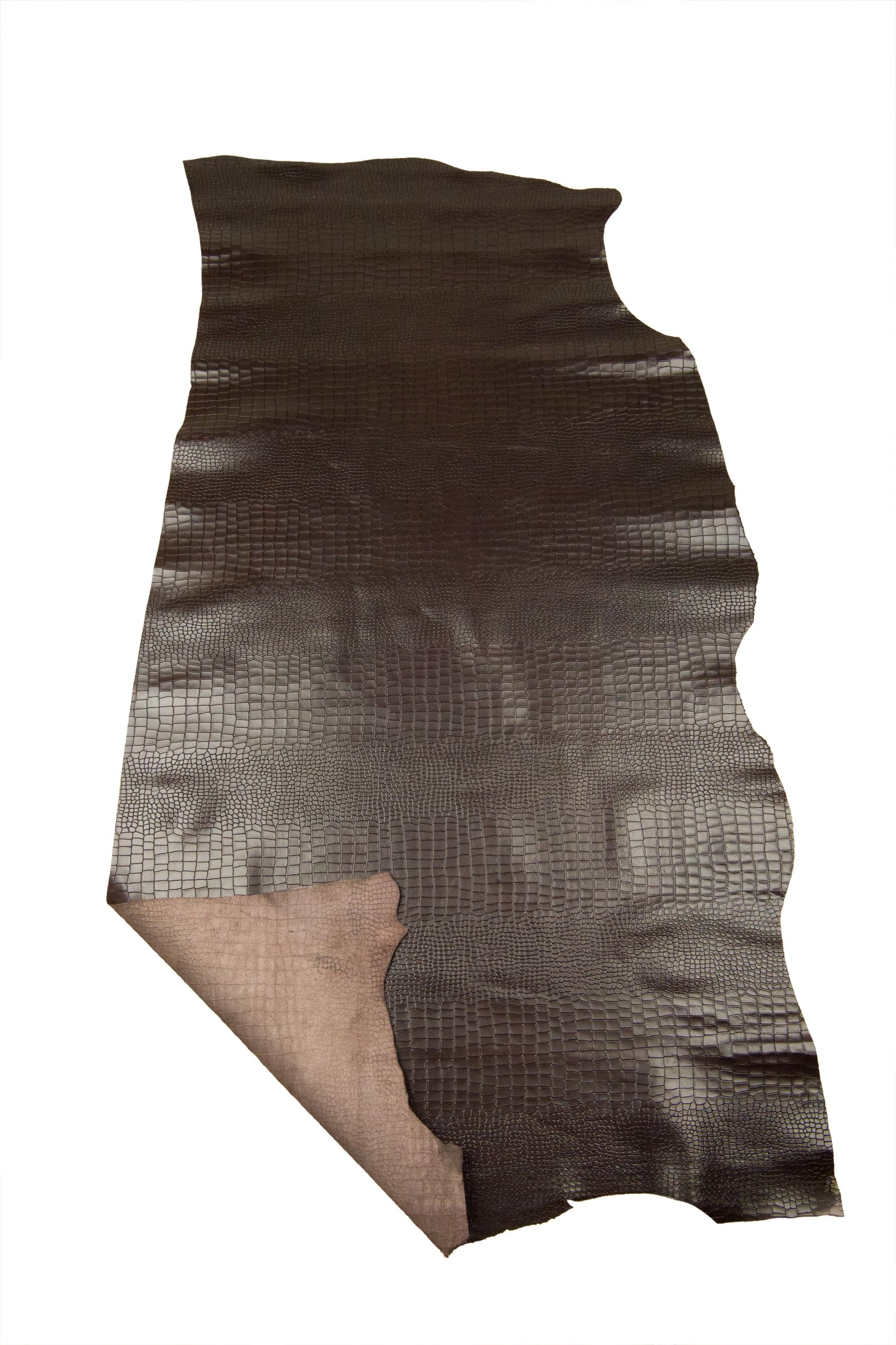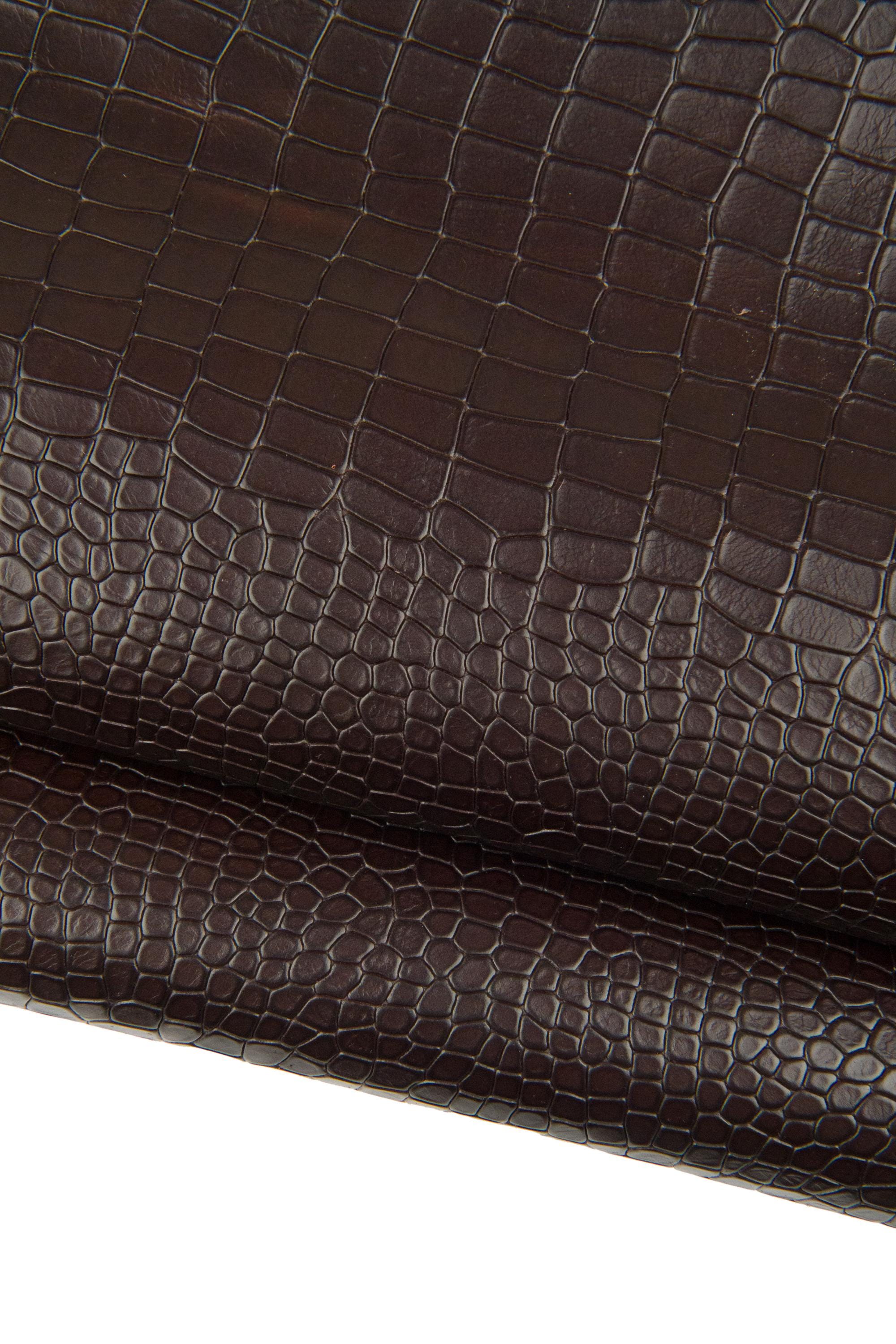 Beautiful dark brown crocodile printed leather hide, semi glossy alligator printed cowhide, soft embossed calfskin for crafters.