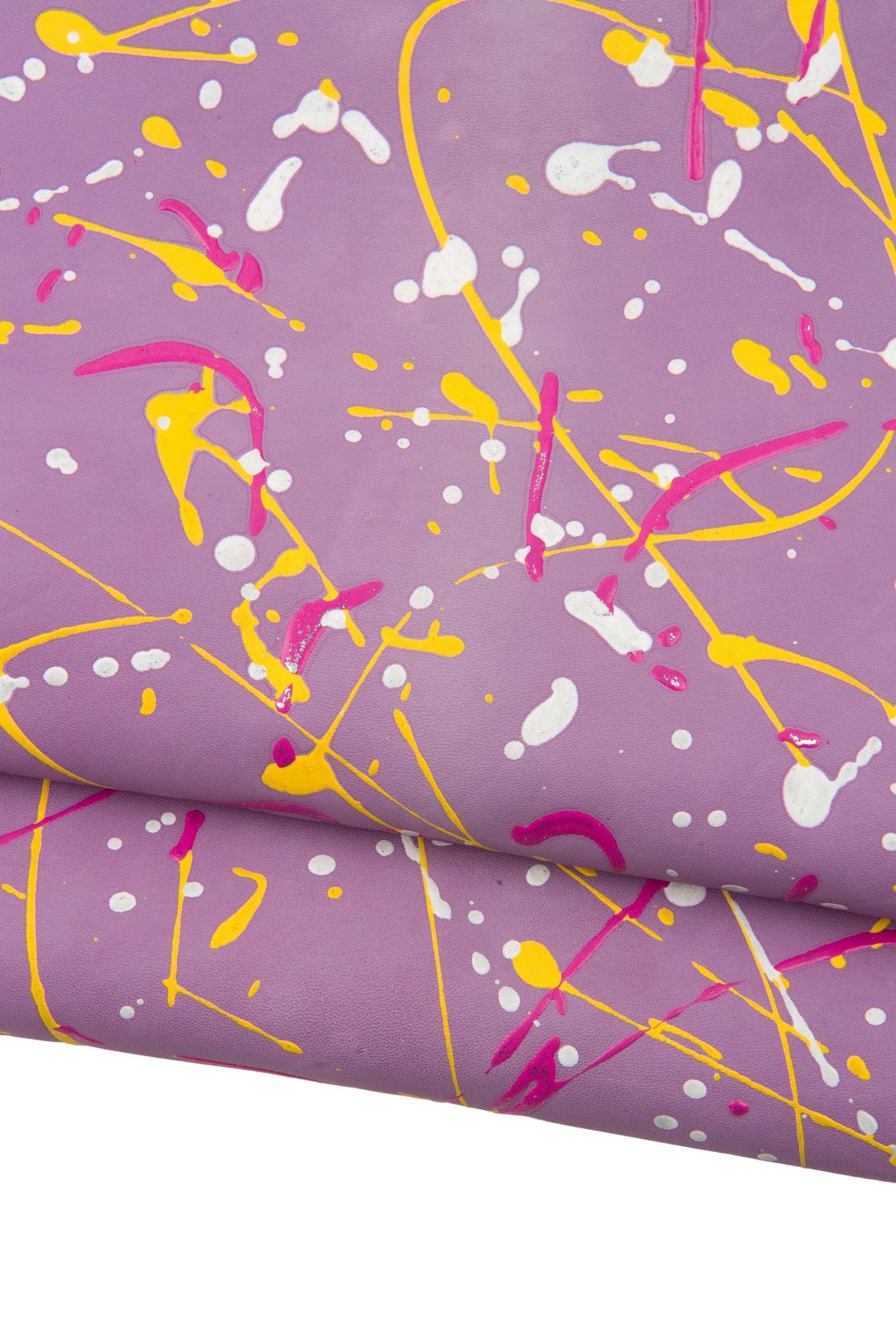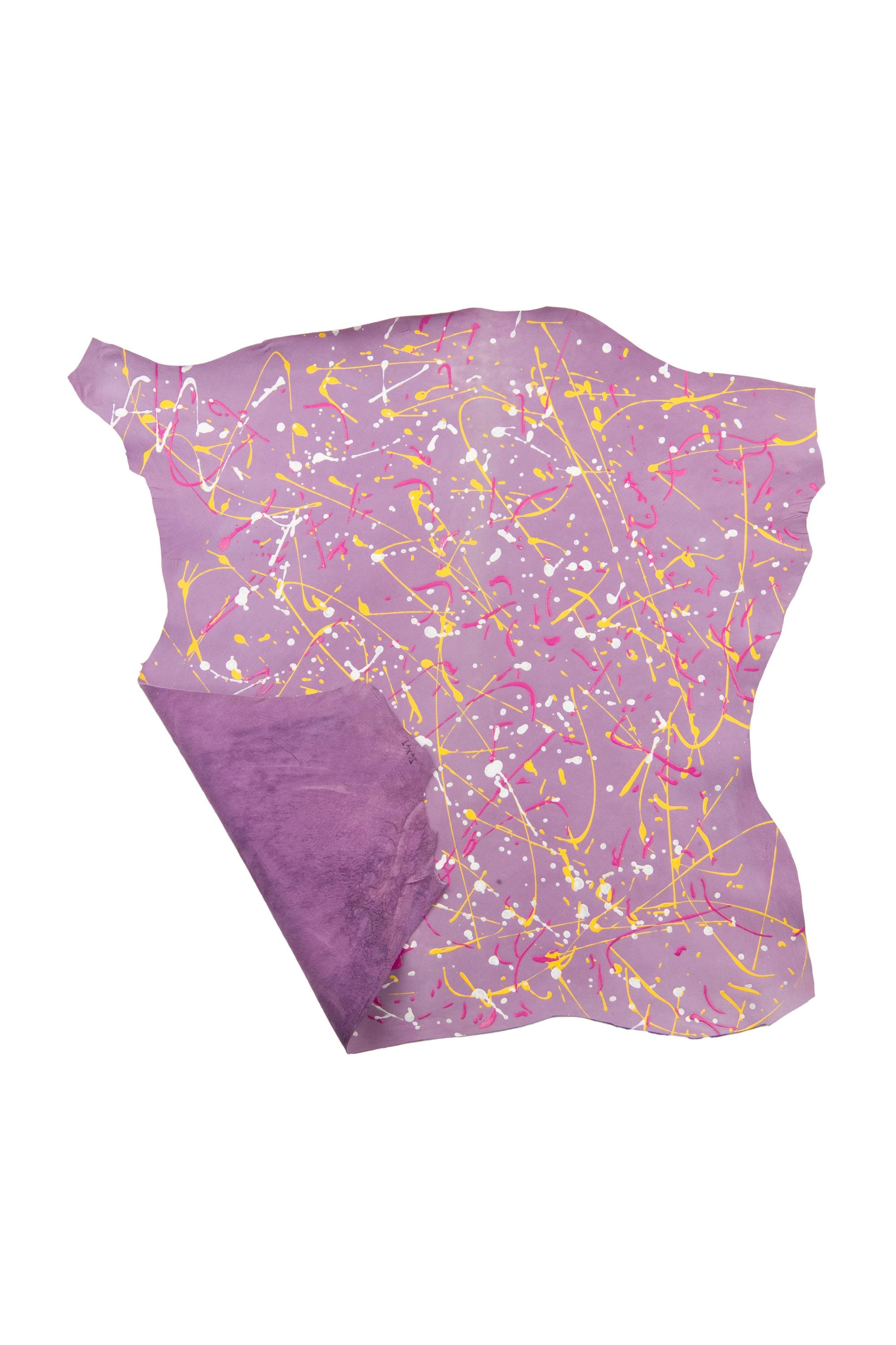 Unique Lilac purple leather skin- yellow, fuchsia, white splash print - hand painted goatskin for hobbyists.