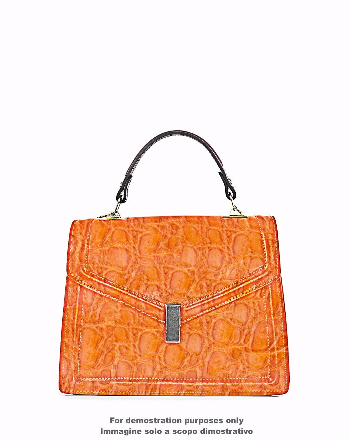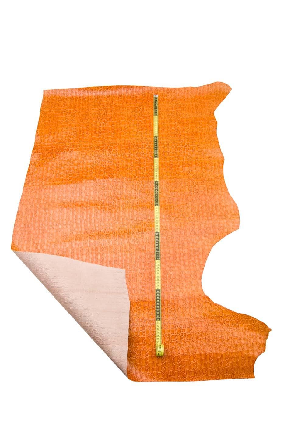 Wonderful orange crocodile embossed leather hide, top quality glossy calfskin, cowhide for crafting. Slightly stiff leather.