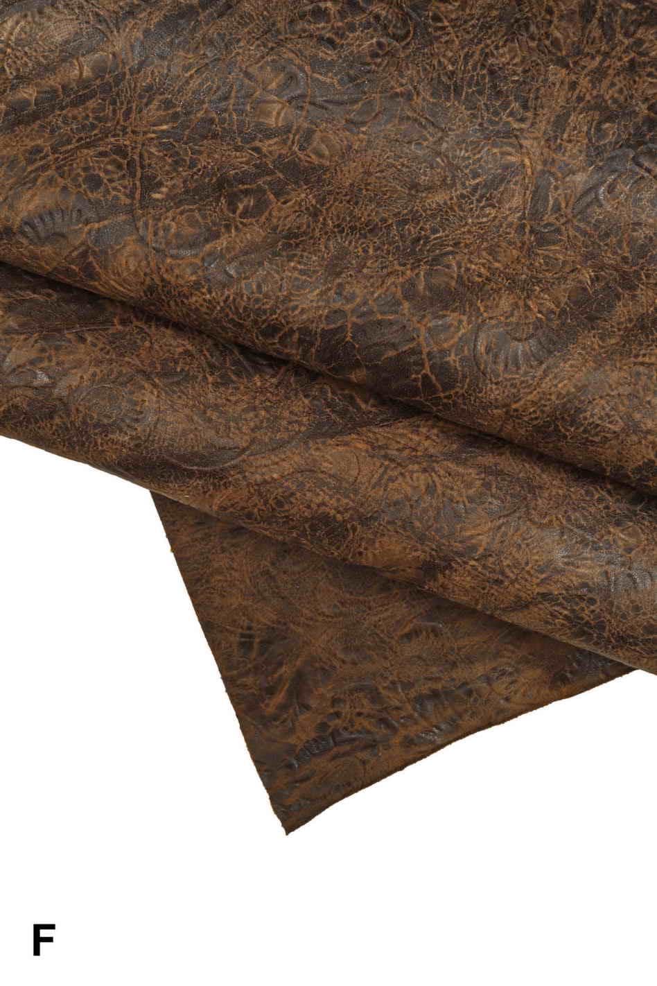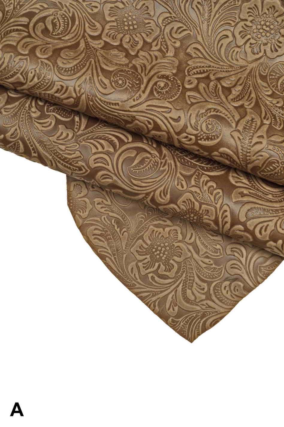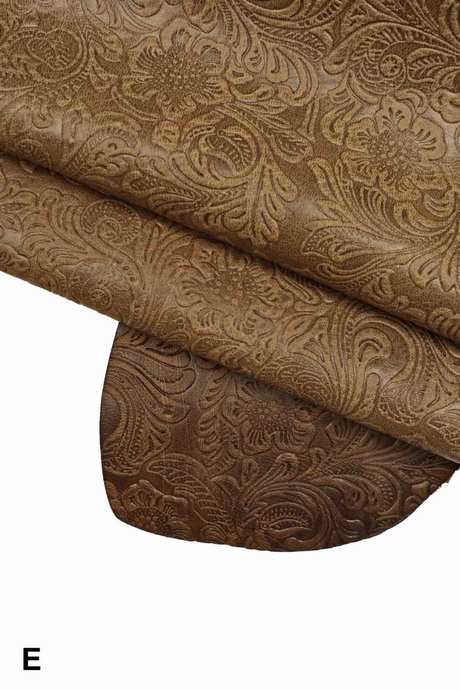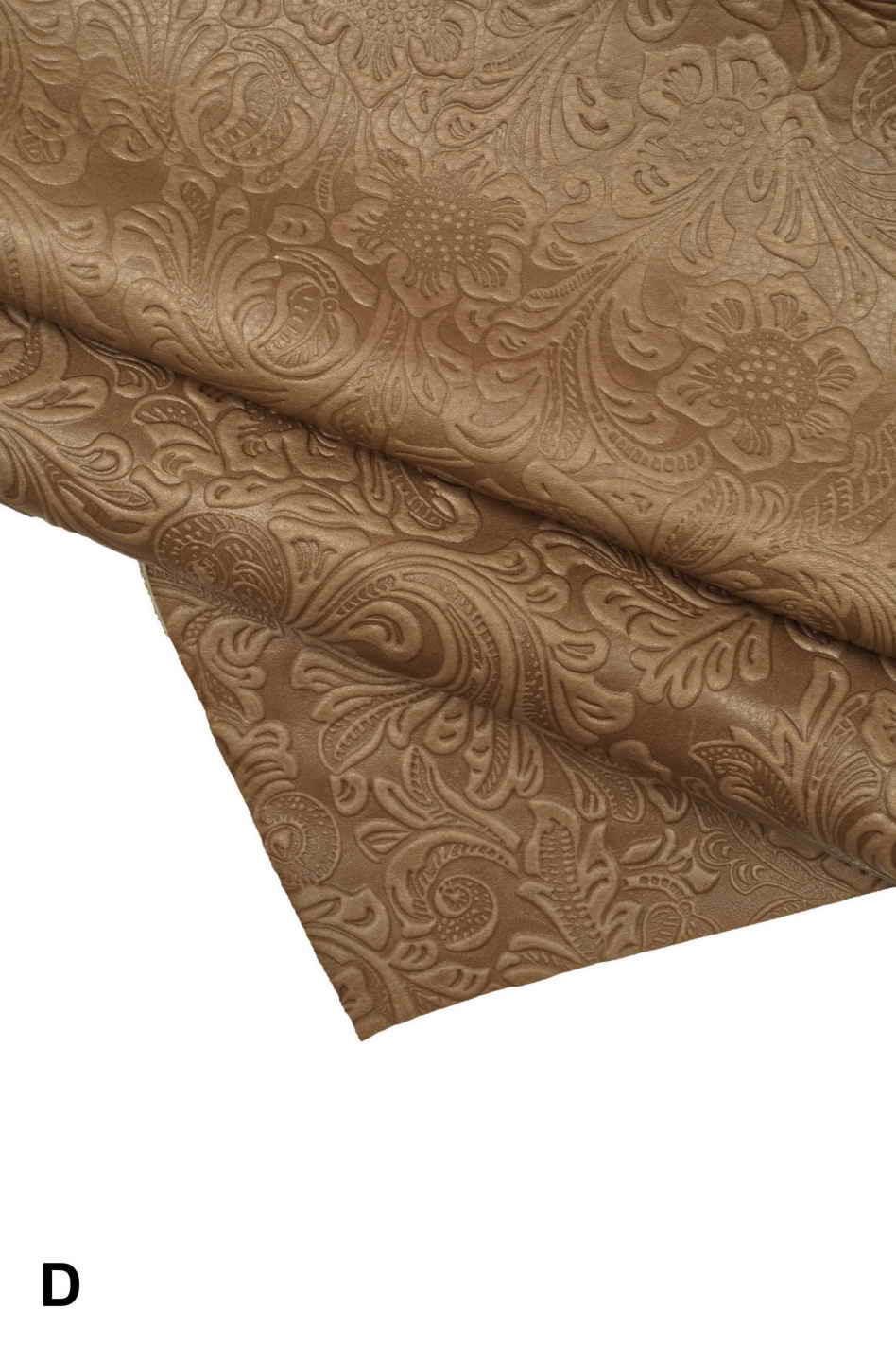 Wonderful calf leather with embossed floral print, vintage and sporty, available in different shades of brown and different finishes.