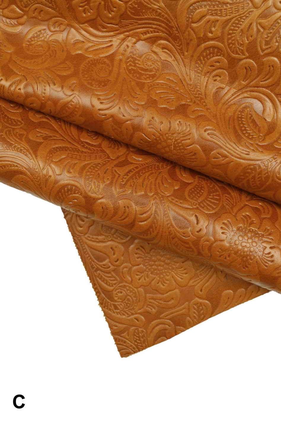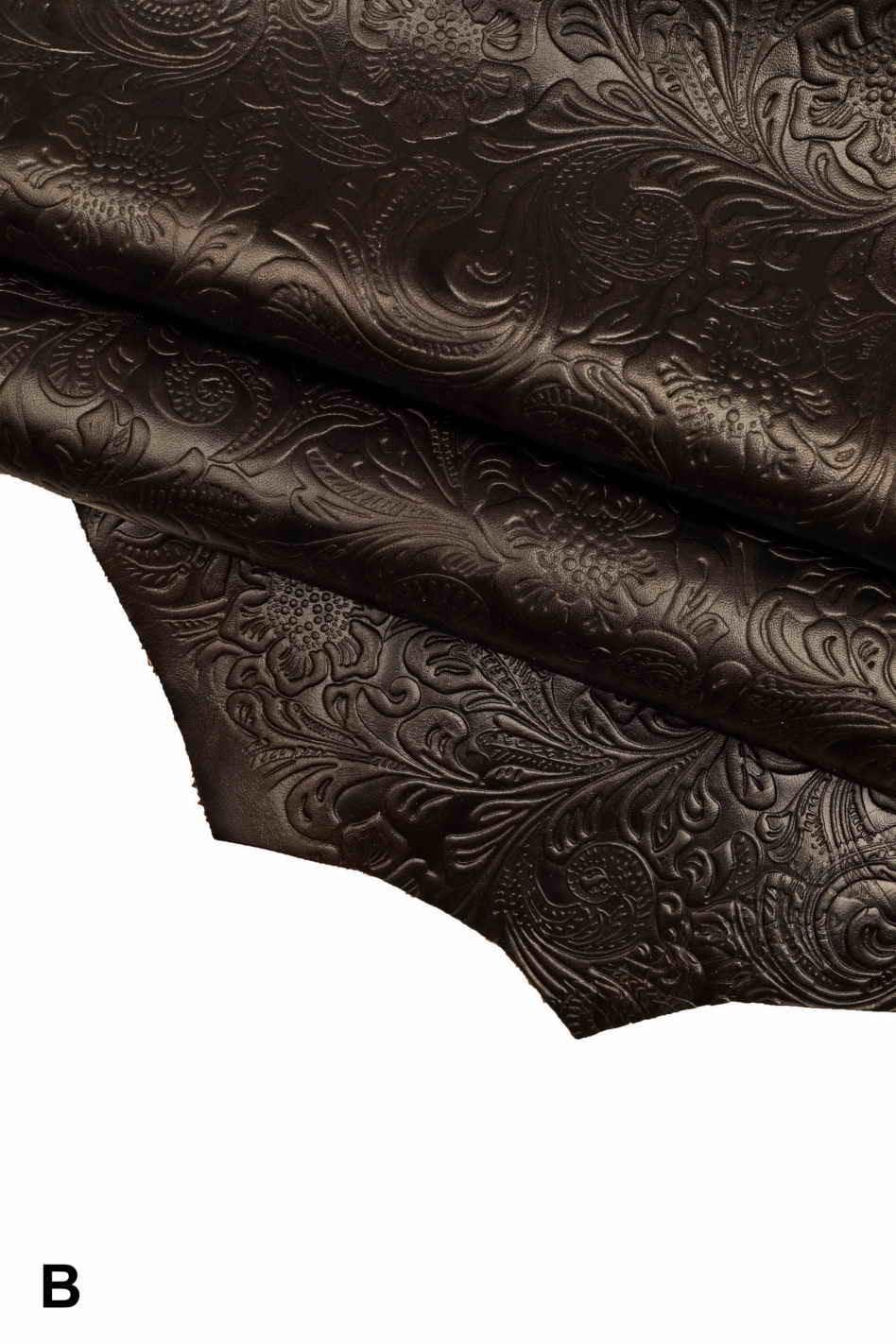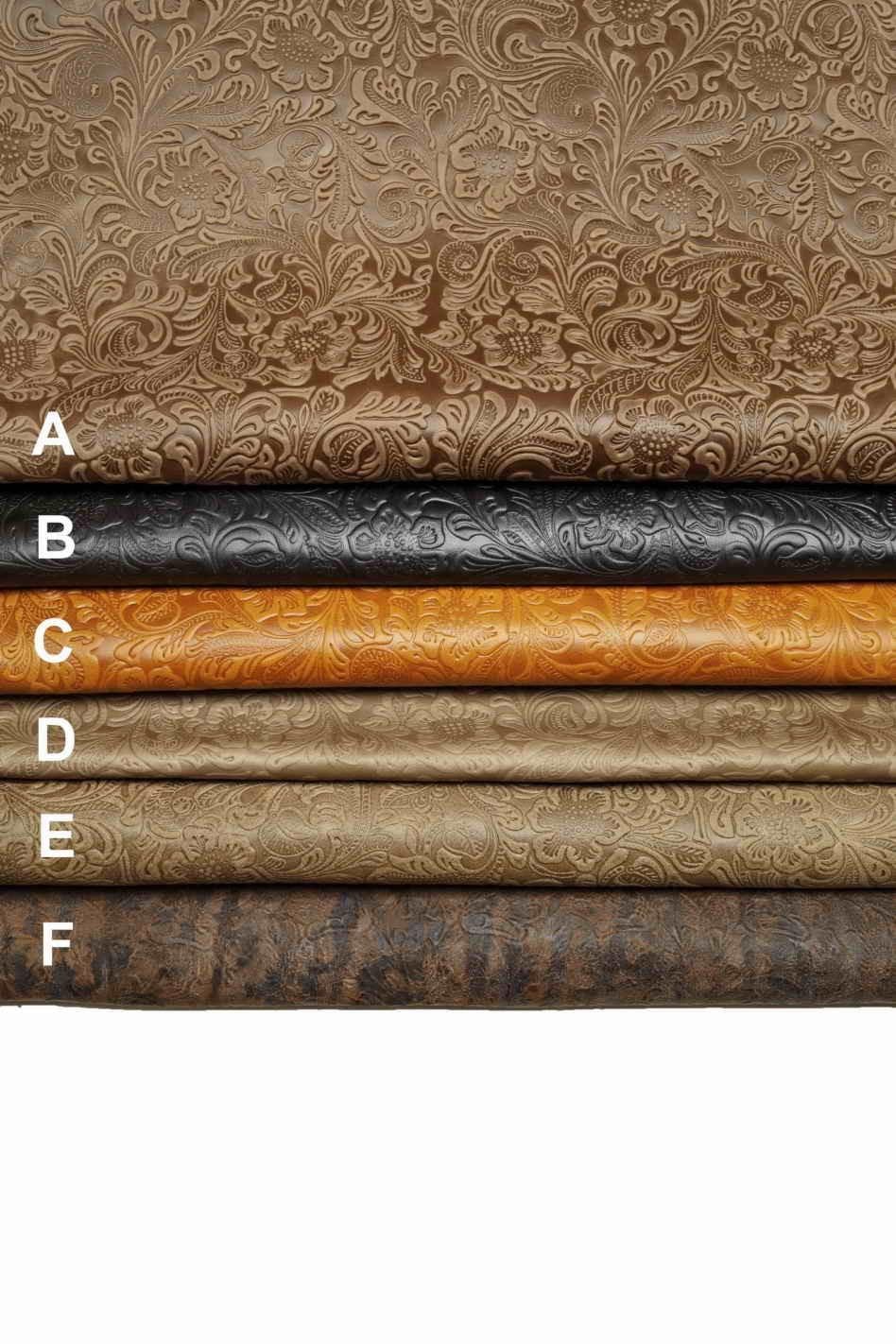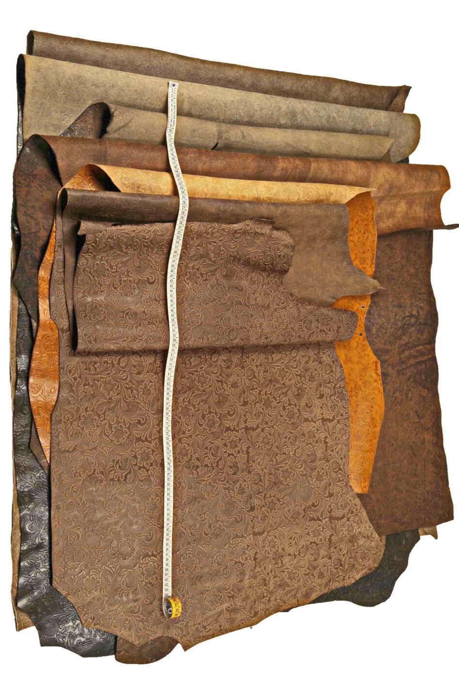 Wonderful calf leather with embossed floral print, vintage and sporty, available in different shades of brown and different finishes.