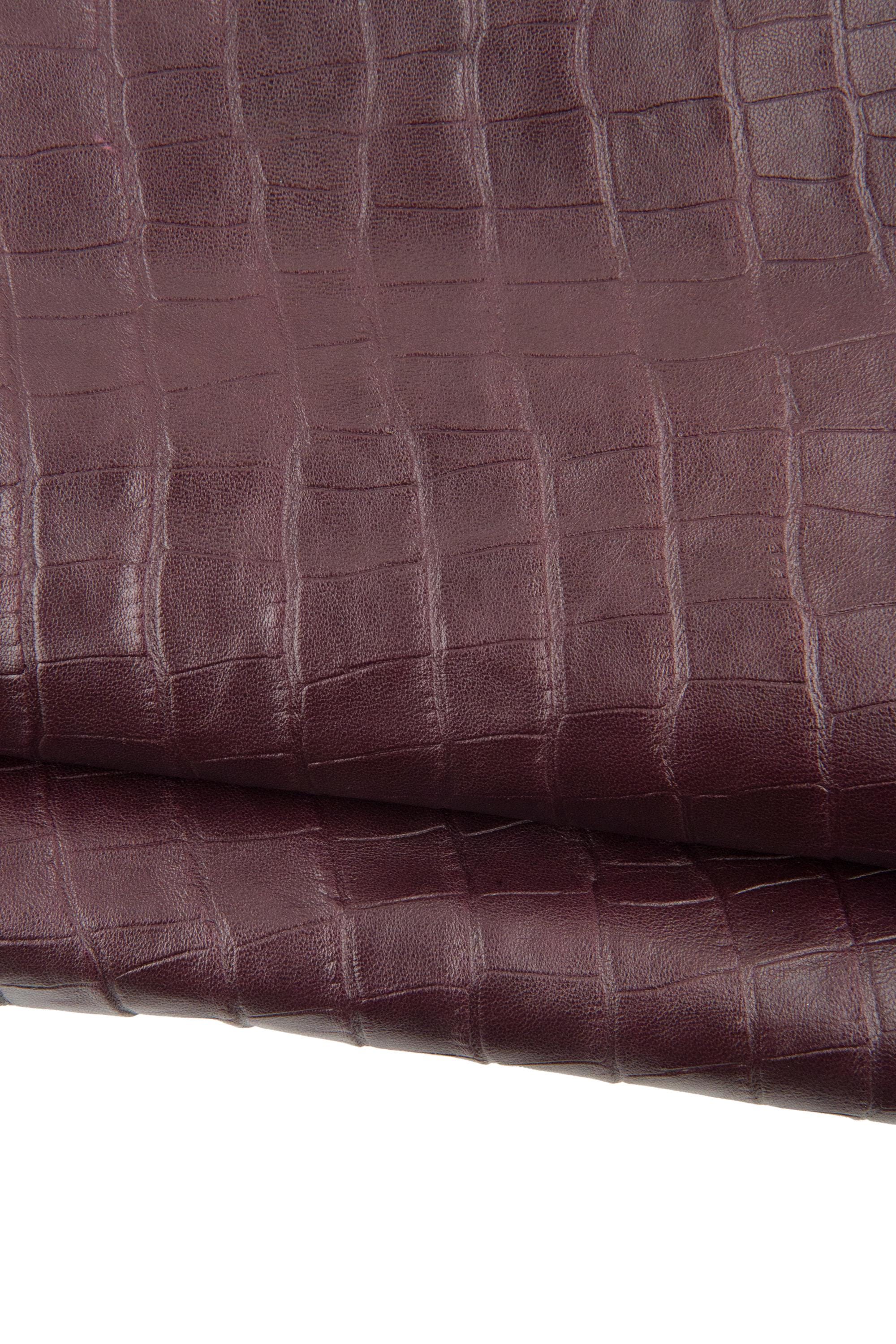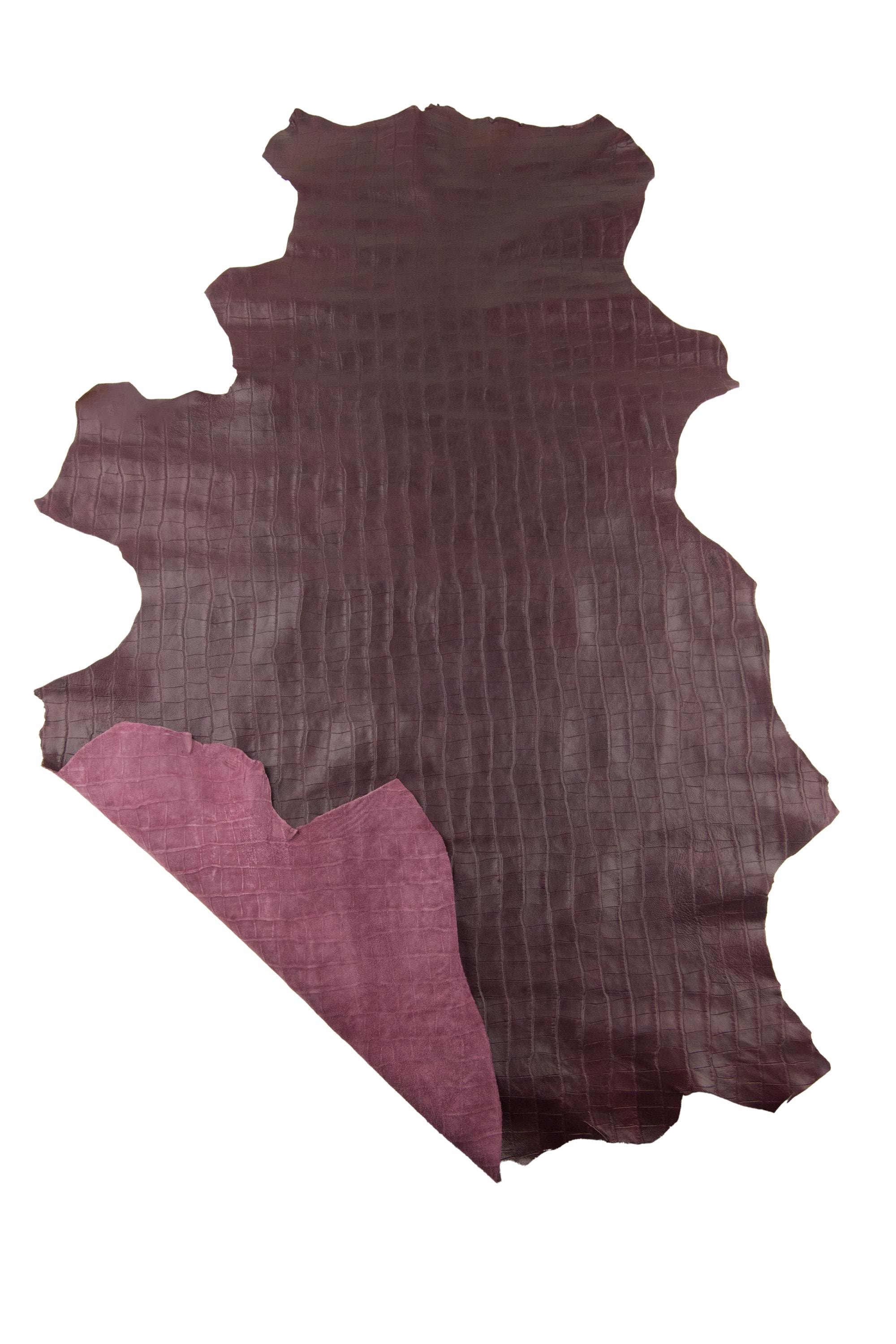 Incredible burgundy alligator embossed leather hide, crocodile print on calfskin, glossy cowhide for crafting.