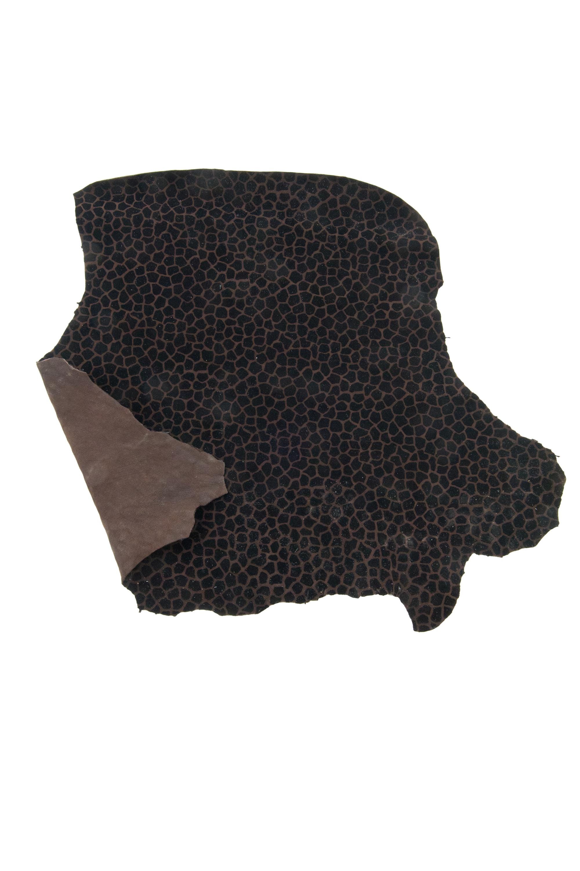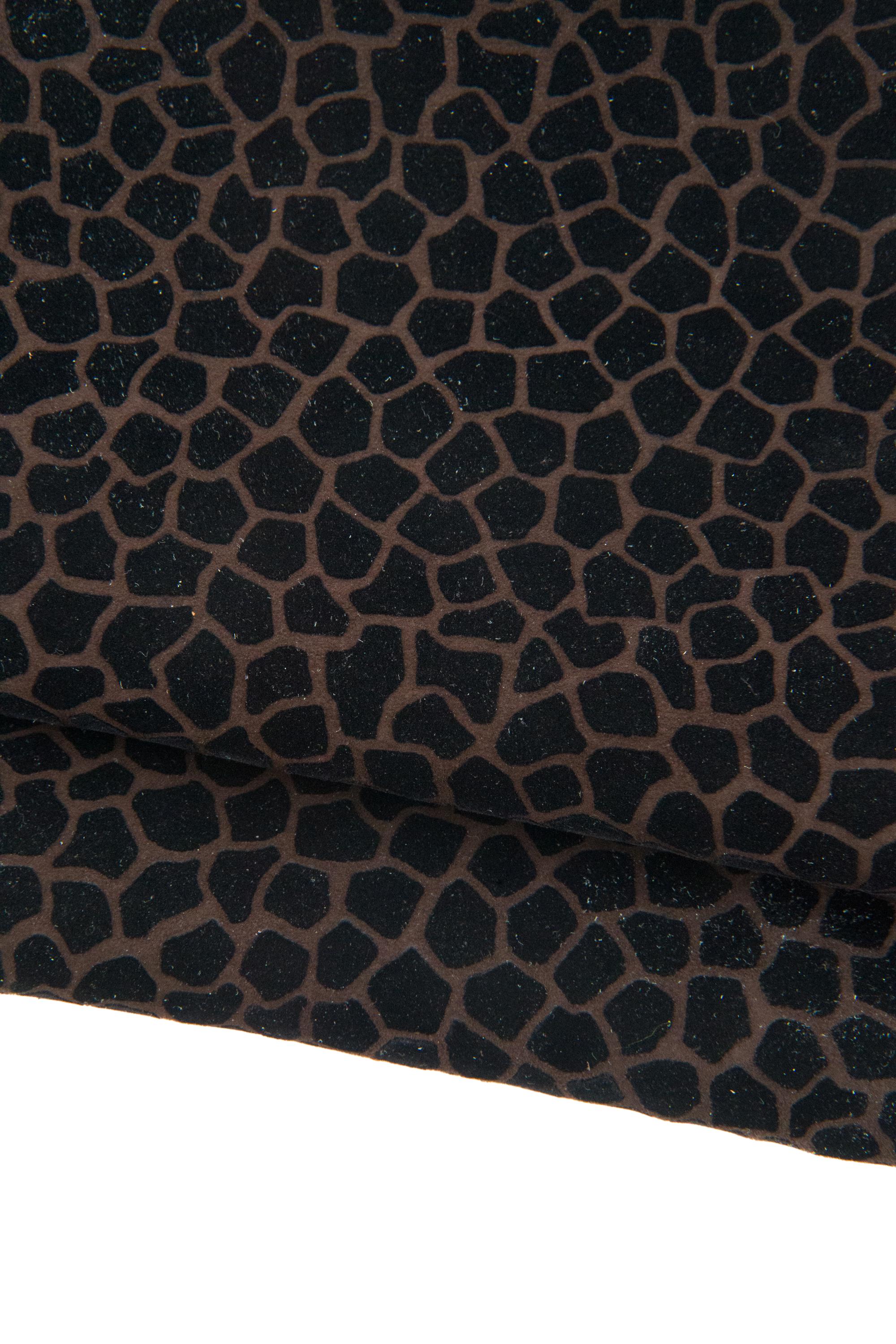 Particular giraffe printed leather skin, black - brown animal textured goatskin, soft winter flocked leather for hobbyists.